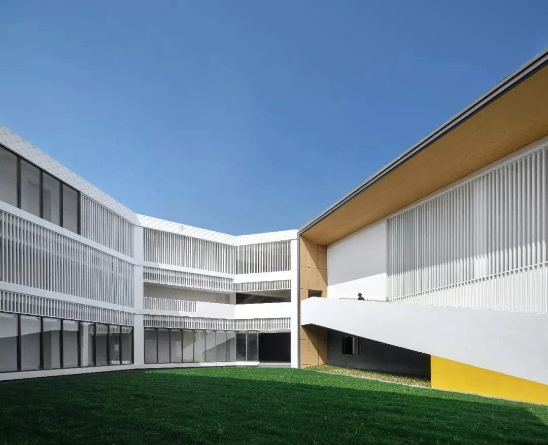 御龍灣幼兒園位于晉江市一個大型住宅開發(fā)地塊內(nèi),設(shè)計以“退讓”為核心策略,著力緩解幼兒園與周邊高層的對峙關(guān)系。建筑體量沿用地展開,以一種類似“甜甜圈”的形態(tài)圍合成一個內(nèi)聚性中心庭院,所有班級單元及輔助用房均圍繞該庭院展開。中心庭院為小朋友們提供了一個安全內(nèi)聚的游戲場地,并為日常全園性集中活動提供了空間。