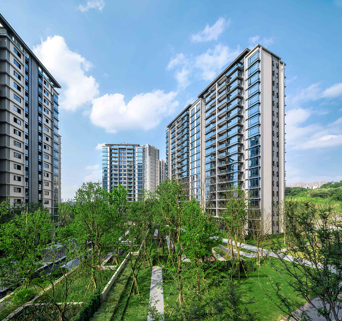 背山面水,藏峰聚氣項目位于重慶市兩江新區(qū)照母山星光大道旁,東側(cè)緊鄰星湖學(xué)校且與龍湖舜山府遙相呼應(yīng),對照一路之隔的重慶腹地照母山森林公園,創(chuàng)造絕佳的優(yōu)質(zhì)景觀資源。合理利用原始地形,處理好橫向交通關(guān)系成為整體設(shè)計的因素。在一塊代表城市源起和根脈的土地上,人文與美學(xué)在此碰撞融合,以輕盈動感的流體語言在重慶這個自然之城訴說著未來人居環(huán)境新的可能。