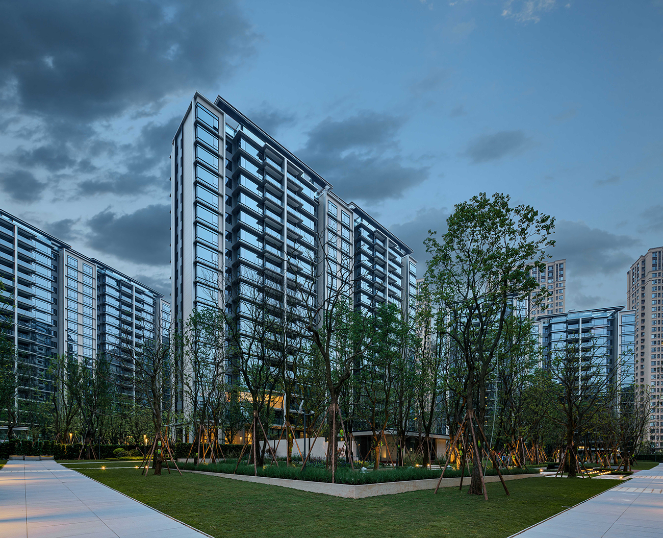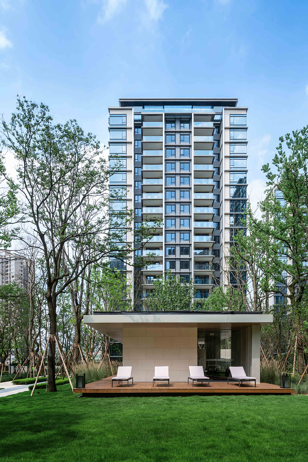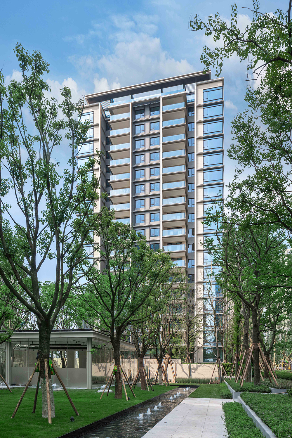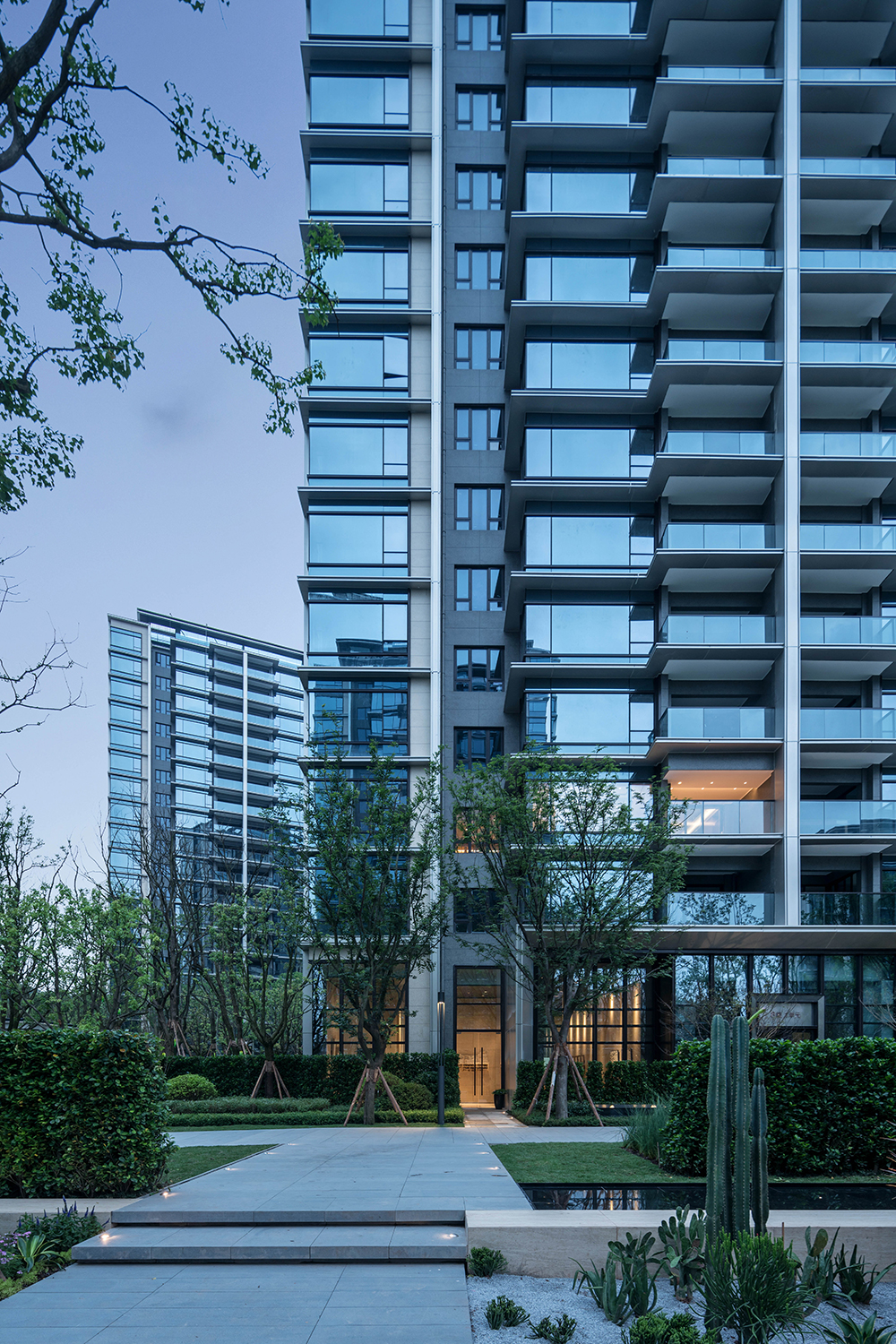 用純粹、干凈的立面處理手法、輔以精致的細(xì)節(jié)把控。通過門頭、屋頂、墻身、陽臺、線腳等精細(xì)化設(shè)計,嚴(yán)控立面節(jié)點,最終的建筑立面呈現(xiàn)出一種儒雅又不失風(fēng)骨的氣質(zhì)。