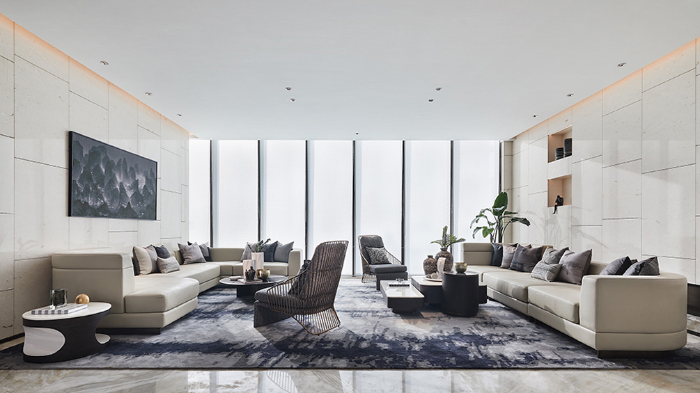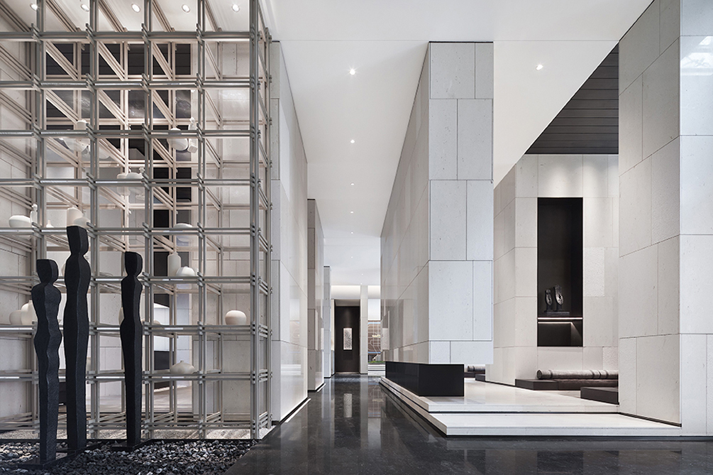 由于塵林間地塊與鄰近路面存在高差關(guān)系,大堂采用了雙層設(shè)計。大堂頂部穿孔鋁板以及配合樹形投影設(shè)計,盡藏生活哲學(xué),體驗不可度量的生活儀式感。