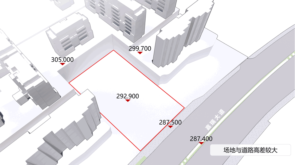 本案依山而筑,場地南北向高差約17米,東西向高差高達35米。基于場地條件,地塊臨嘉瑞大道西側(cè)為體驗中心的最佳且唯一的城市接駁點和人流導(dǎo)入點。利用地形高差,展示區(qū)與城市道路及樣板樓形成高差錯落的山地庭院景觀,鑒于周邊現(xiàn)狀條件的復(fù)雜性,我們認為采用“隱”是該項目規(guī)劃設(shè)計策略中主要處理手法。設(shè)計中在前場空間采用半圍合私密庭院來減少城市干道對于住區(qū)的干擾。