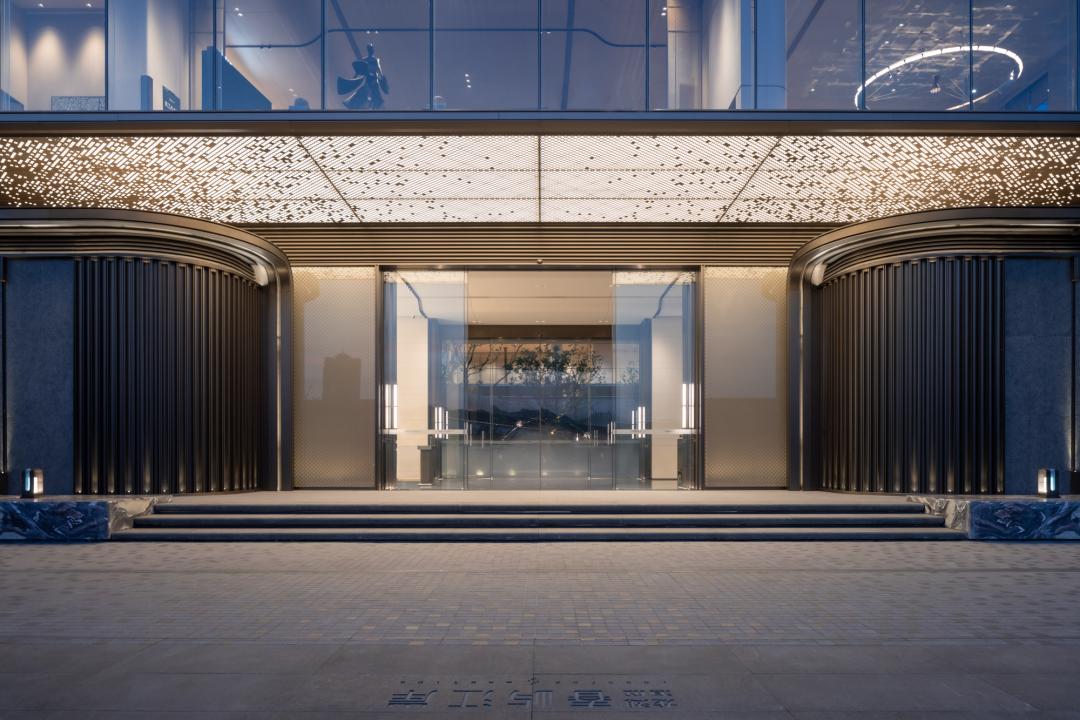 自城市道路抵達展示中心,就是一種由公到私的體驗過程,我們用三大主題場景空間,匠筑與實踐共舞的詩意居所。前場空間運用秩序的林徑于樹影婆娑之間,人們漫步于建筑入口,輕奢景墻環(huán)抱。明鏡的玻璃搭配精致的不銹鋼讓人仿佛置身于度假酒店的大門,下部近景的不銹鋼細節(jié)及夢幻的星空頂營造出典雅奢華的入口。