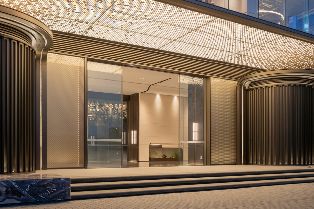 建筑體量的構(gòu)成關(guān)系則通過外圍香檳金及銀色鋁板線條和中間大面積超白玻體量之間形成一種包絡(luò)關(guān)系,同時又發(fā)生了一定程度的內(nèi)外收分,入口側(cè)則出現(xiàn)了干凈純粹玻璃盒子漂浮于基地之上的輕盈靈動空間效果。