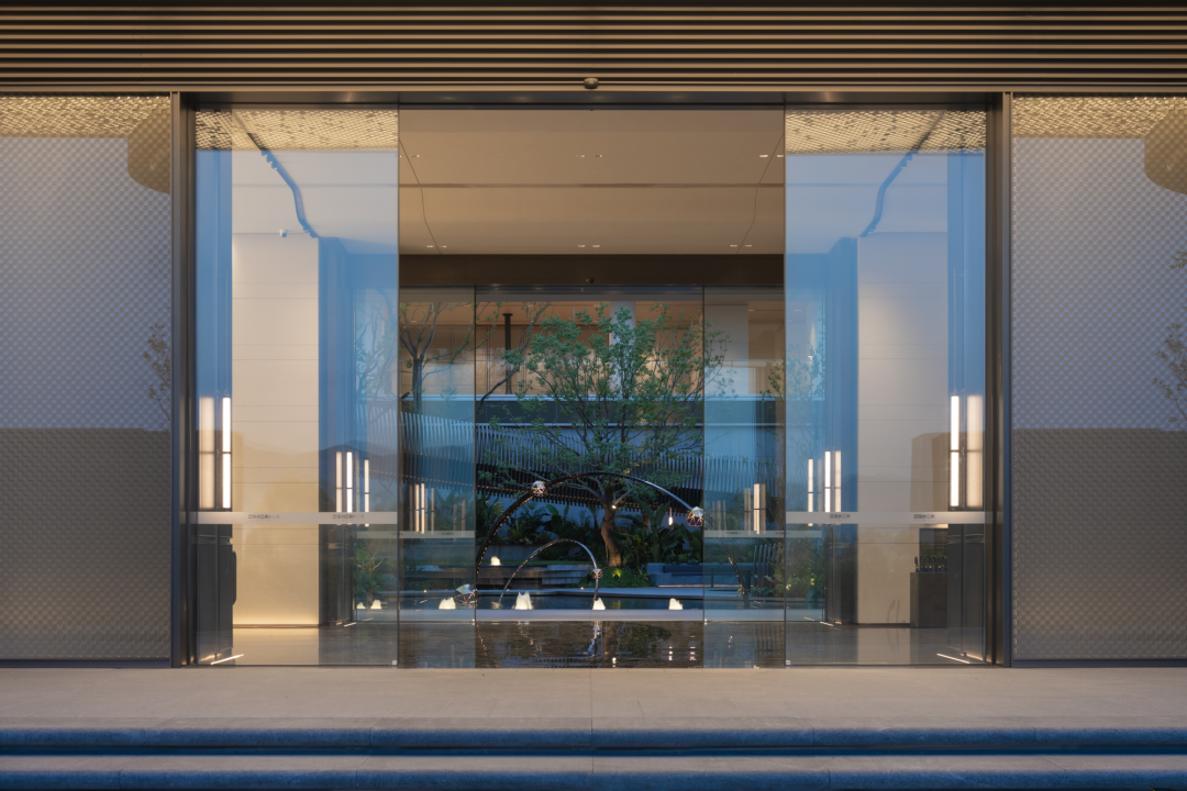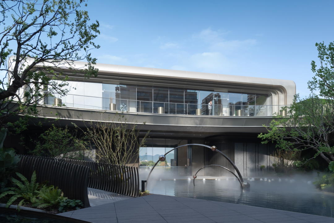 穿過大堂,漂浮、旋轉(zhuǎn)的下沉庭院構(gòu)成了流光水院的后場空間。后場景觀以行星繞日為設(shè)計理念,講述了瑩瑩星體的盤行軌跡。而大堂雖然只是一個建筑空間,但它卻是多個不同的場所。它不僅具有接待的功能性,還承接了內(nèi)外景觀資源,串聯(lián)起遠處的山脈與私密的下沉庭院,從庭院中回看,宛如一幅水墨畫般映入眼簾。