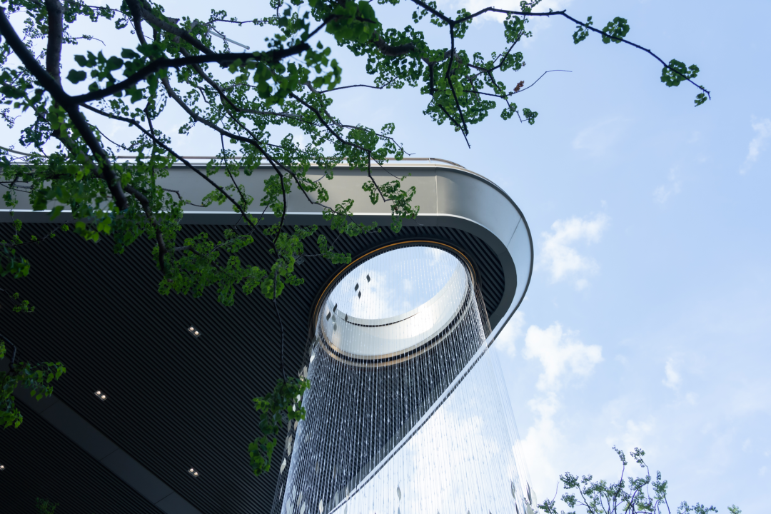 立體浮橋,透光織印,連橫交縱。潺潺的流水,從空中墜落,如銀河繁星般灑落下來。喬灌木的綠意點綴,人行廊橋穿梭其中,一幅自然的畫卷油然而生,讓人們身心愉悅,勾起探索之欲。