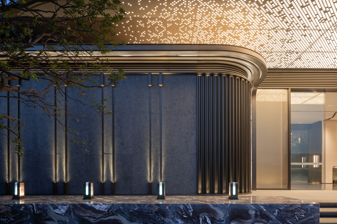 沿著庭院廊橋拾級而上,漫步在自然的院落中,建筑緩緩展現(xiàn)在我們眼前。暖暖的米色墻面搭配著高級灰,香檳金的金屬線條勾勒出建筑的輪廓,建筑上弧形的線條,入戶大堂弧形的玻璃讓我們忘記了鋼筋混凝土的堅硬,我們的心慢慢融入這個園區(qū),享受此刻的寧靜和諧。