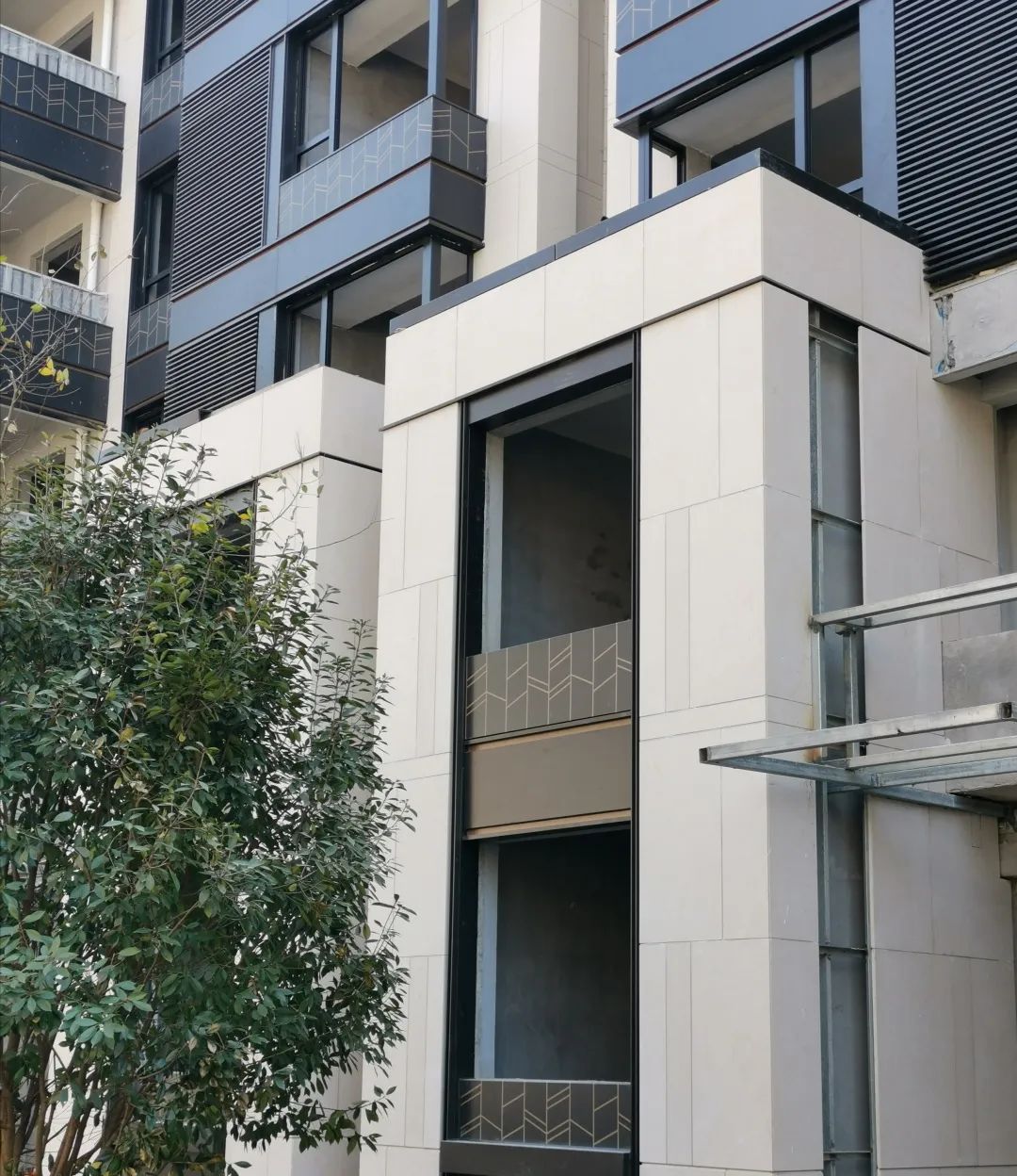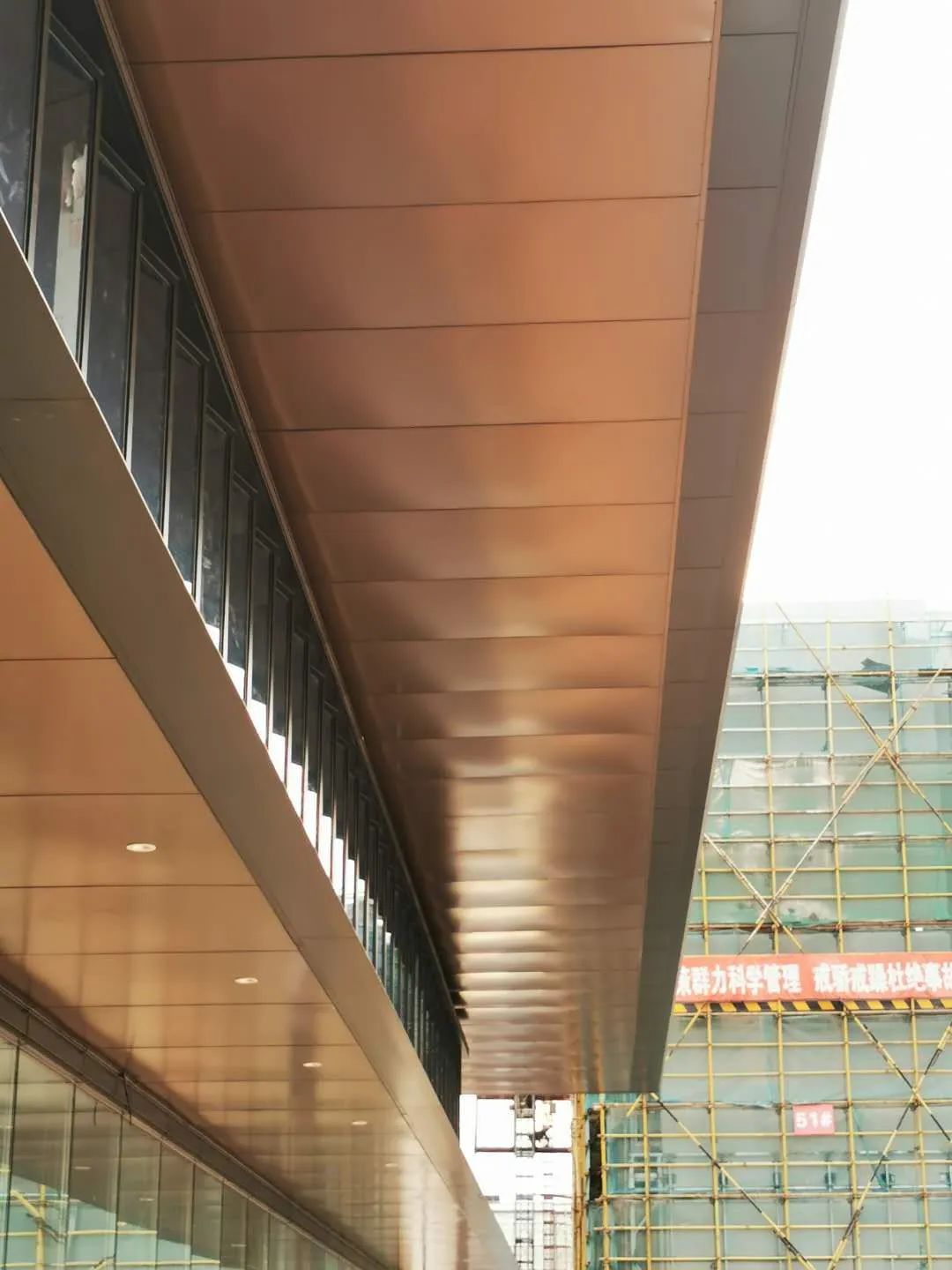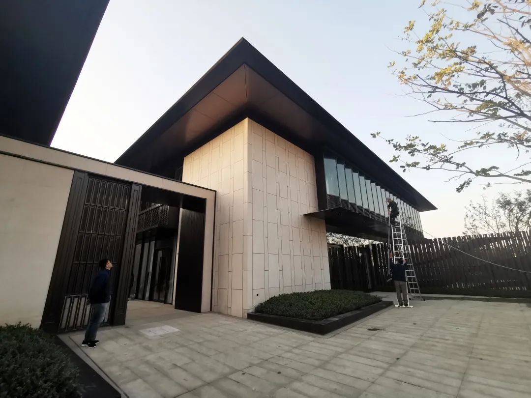 如入境“府院”區(qū)域建筑立面貼磚未采用常規(guī)橫向的方式,而是采用了竹節(jié)式的拼貼,與色澤古雅的古銅色金屬構(gòu)架和不銹鋼拉絲面相配,輔以LED黃色柔性燈帶,呈現(xiàn)匠心精筑的美好人居。雖棄繁就簡(jiǎn),亦不忘琢磨細(xì)節(jié)。