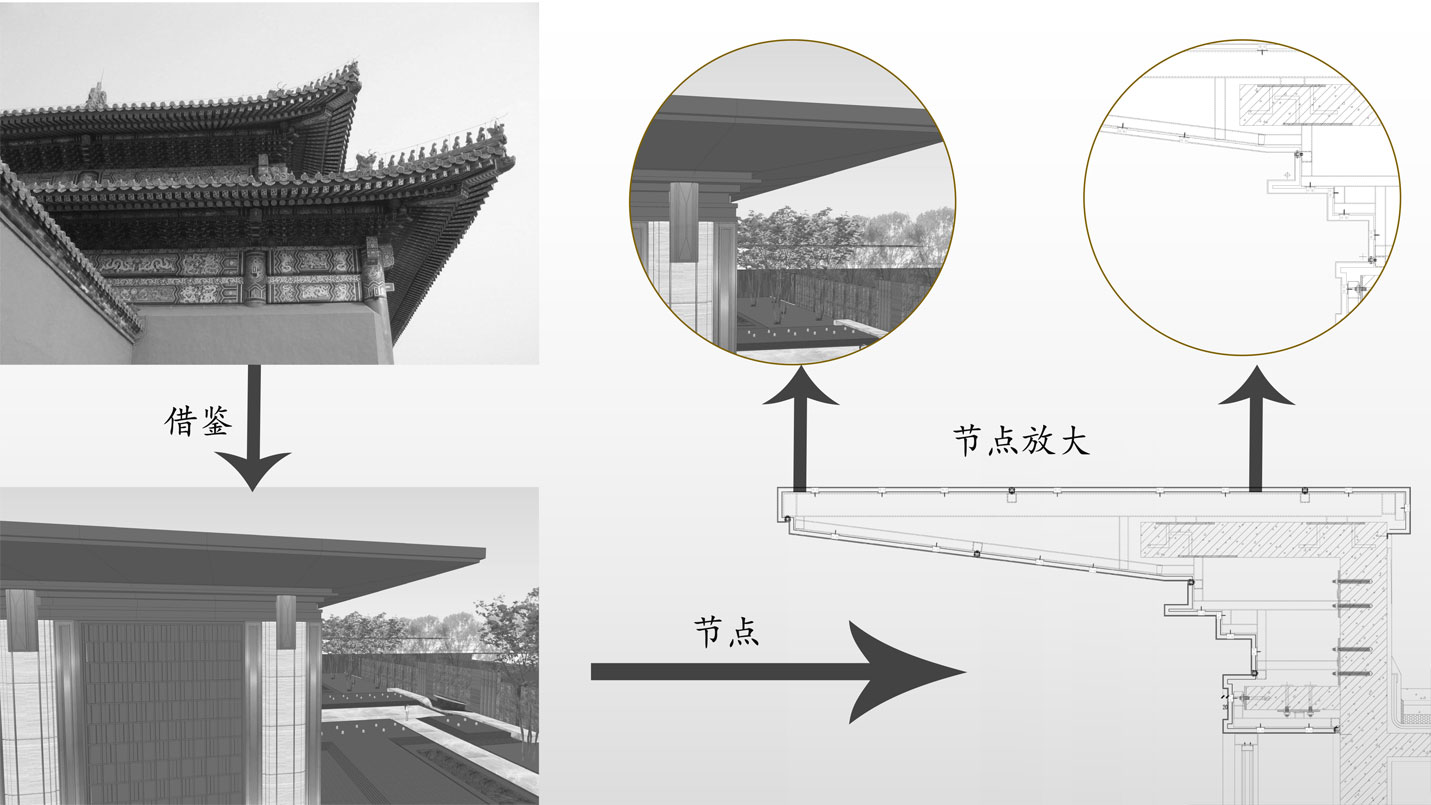 采用重檐的方式來強調(diào)建筑的尊貴感,追求建筑的比例,運用現(xiàn)代手法簡化繁復(fù)的屋頂形式。靈活運用“屋檐起翹”的原理,用反向弧形塑造輕盈之感。