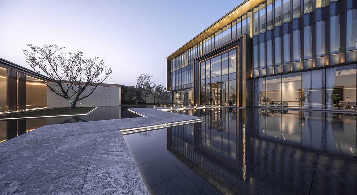建筑前場空間較為局促,設(shè)計(jì)借鑒傳統(tǒng)蘇州園林的造園手法,采用起承轉(zhuǎn)合的路徑設(shè)置,拉長體驗(yàn)動(dòng)線,通過層層遞進(jìn)的五重空間放大整個(gè)示范區(qū)的場景感受。