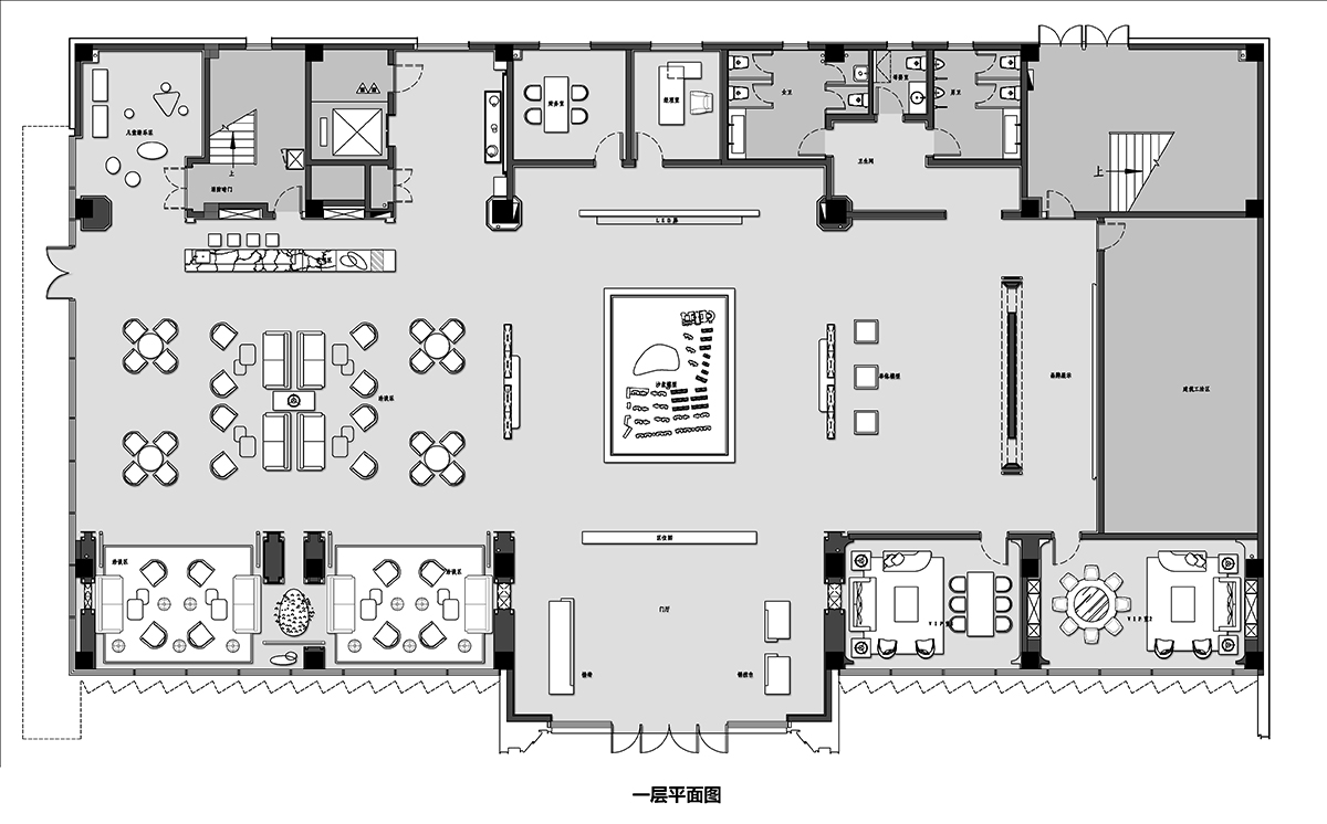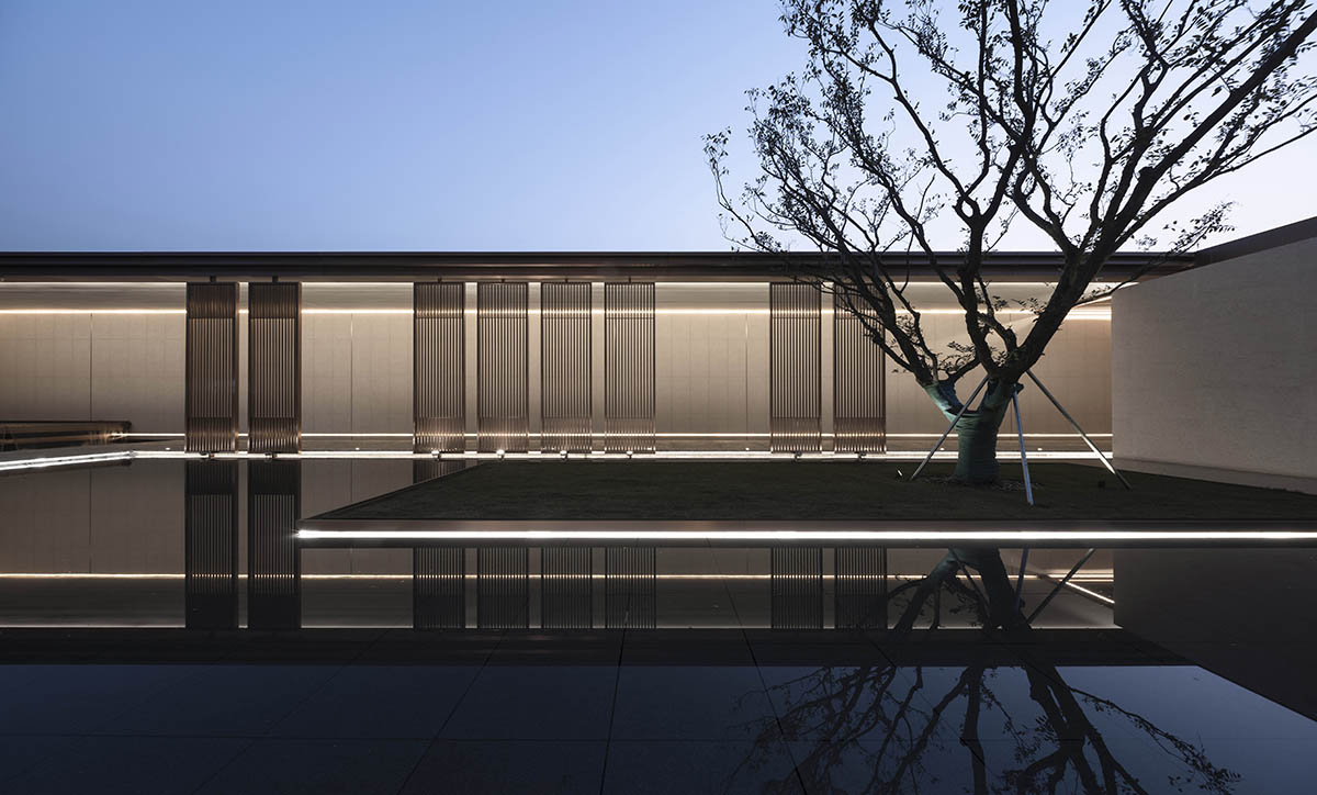 入口處影壁障景;轉(zhuǎn)入連廊,透空格柵借景;汀步水院,抬頭見景;進(jìn)入建筑,落座觀景;折入側(cè)院,自成一景。五重空間曲折回環(huán)、以小見大,意在營造一種虛實(shí)相間的空間序列和縮微園林的意趣。