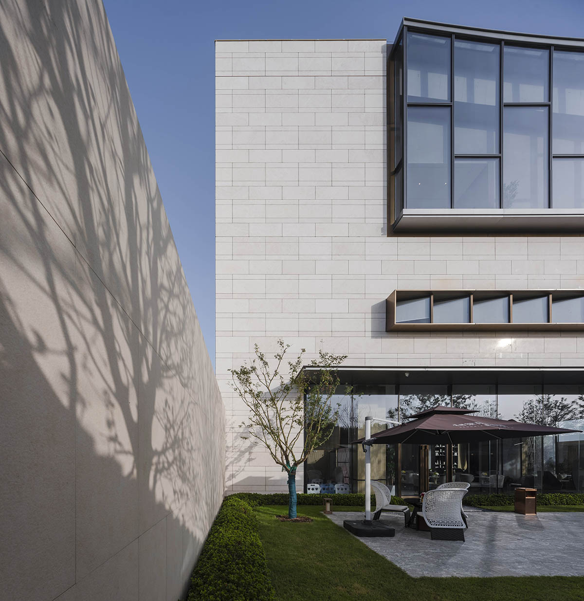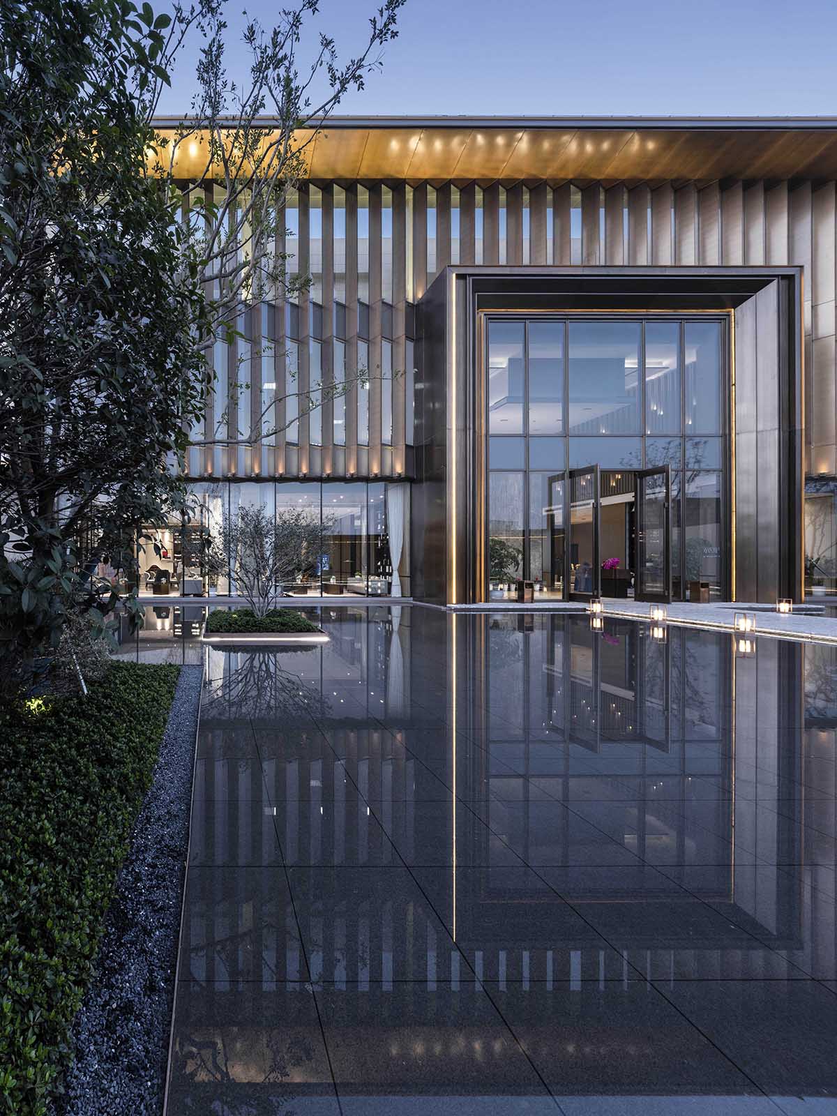 傳統(tǒng)的蘇州是清雅的,小橋流水人家;現(xiàn)代的蘇州又是熱烈的,準(zhǔn)一線城市,年輕又時(shí)尚。蘇州這座城市的精神特質(zhì)是既傳統(tǒng)又現(xiàn)代,既清雅又熱烈。 ??? 在建筑立面的材質(zhì)選擇上,也著力體現(xiàn)這種雙重性。建筑以淺米色溫潤石材為表皮,包裹內(nèi)側(cè)香檳色仿銅鋁板,在輕與重、明與暗、淡雅與濃烈之間形成強(qiáng)烈的反差對比,建筑的張力由此彰顯。