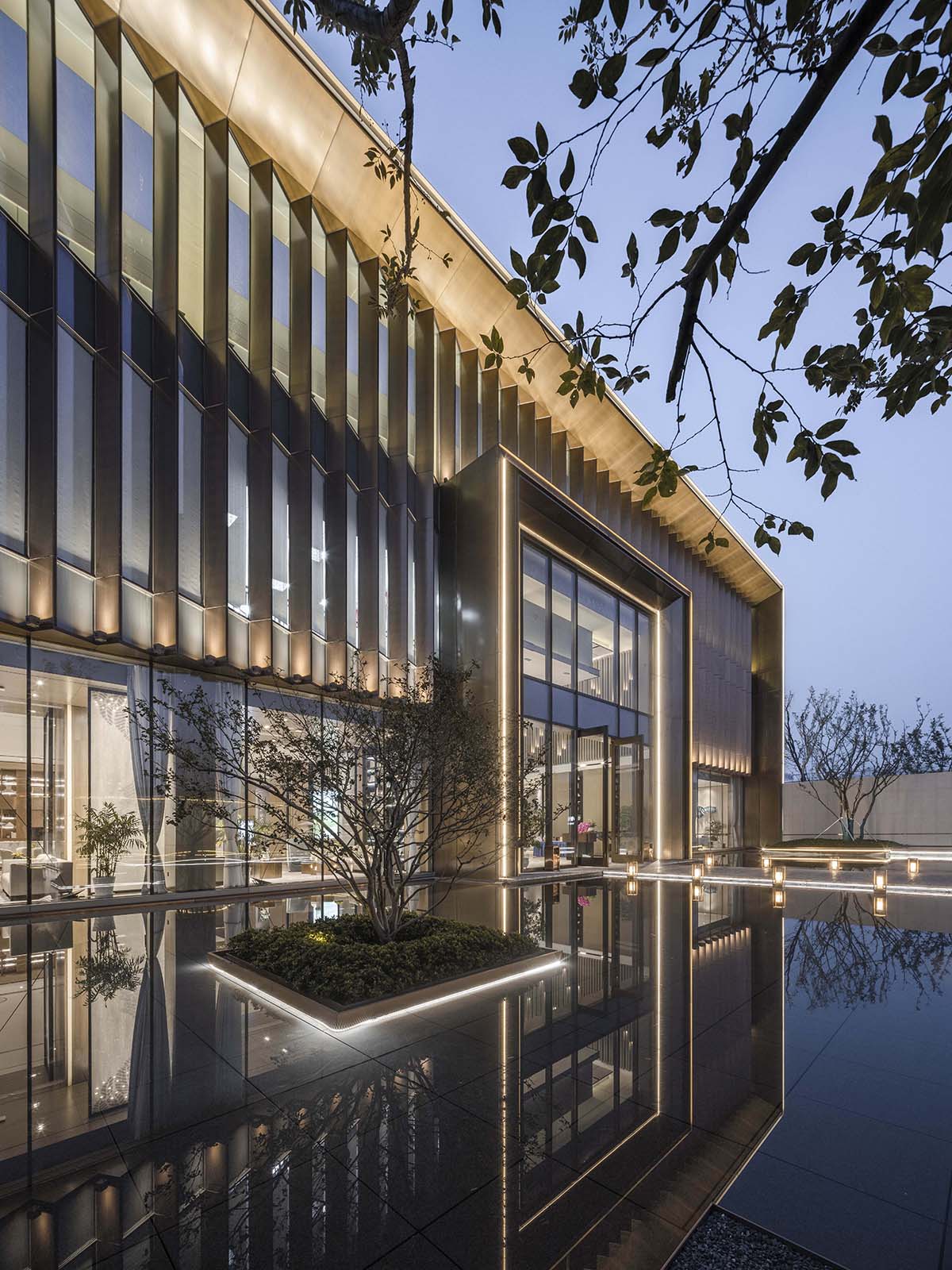 仿銅鋁板與玻璃成折板組合,一側(cè)硬朗,一側(cè)通透,構(gòu)成另一重反差對比。折板在建筑主立面上如一把折扇打開,形成明暗和色彩的韻律組合。建筑一層為展示大廳,二層為辦公,三層為樣板房,為保證樣板房的自然采光通風(fēng),南側(cè)做了局部露臺??紤]到后期商業(yè)立面的整體性,露臺南側(cè)做了折板通高處理。