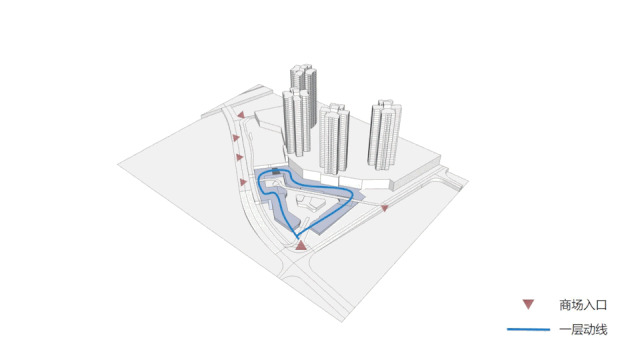 環(huán)形動線的設(shè)計,使城市空間以開放街道的形式滲透入綜合體,建筑主動線與開放街道重合,并形成綜合體內(nèi)部半敞內(nèi)街。也將內(nèi)部步行交通系統(tǒng)融入城市立體步行系統(tǒng),在地下、地面、空中和屋頂多個層面提高綜合體的可達性。