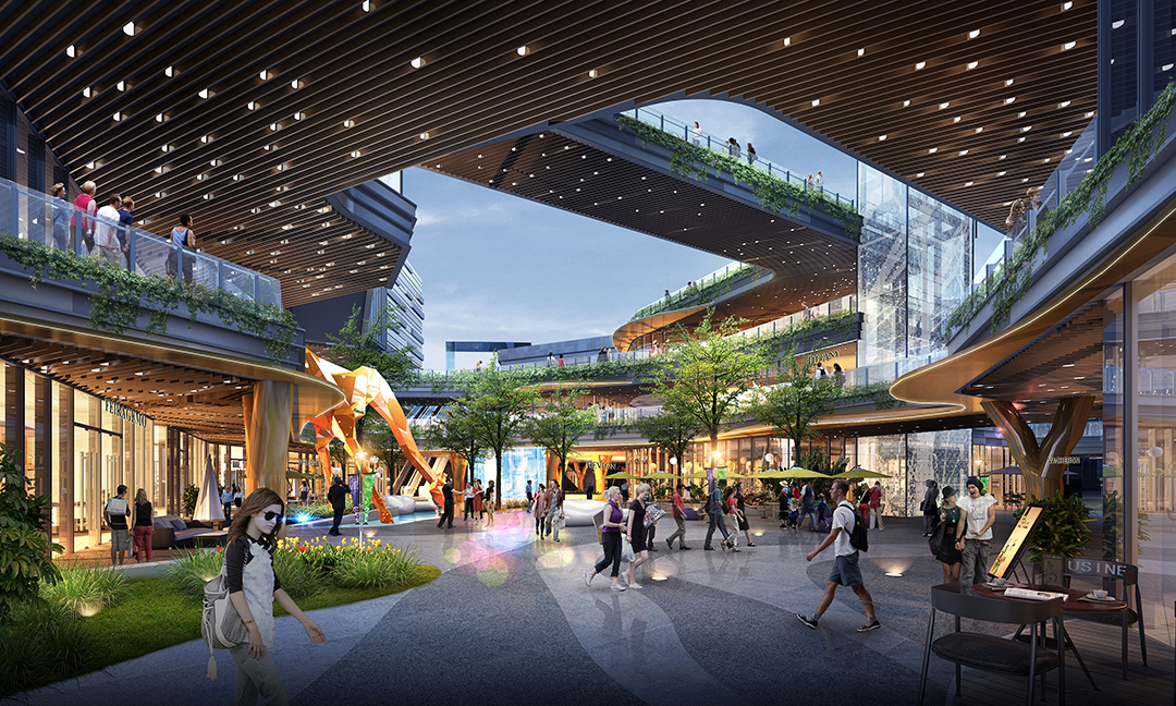 內(nèi)部中心花園四周環(huán)繞著如流水一般的曲線露臺,各種植被耕種于層疊的露臺中,嫣然是城市中的綠洲。多層次的花園形式,以及廣場中心大面景觀墻的處理,使商業(yè)有了呼吸及生命力,綠植、燈光、水系、音樂從多維度給予人們一種林間穿梭的體驗感。