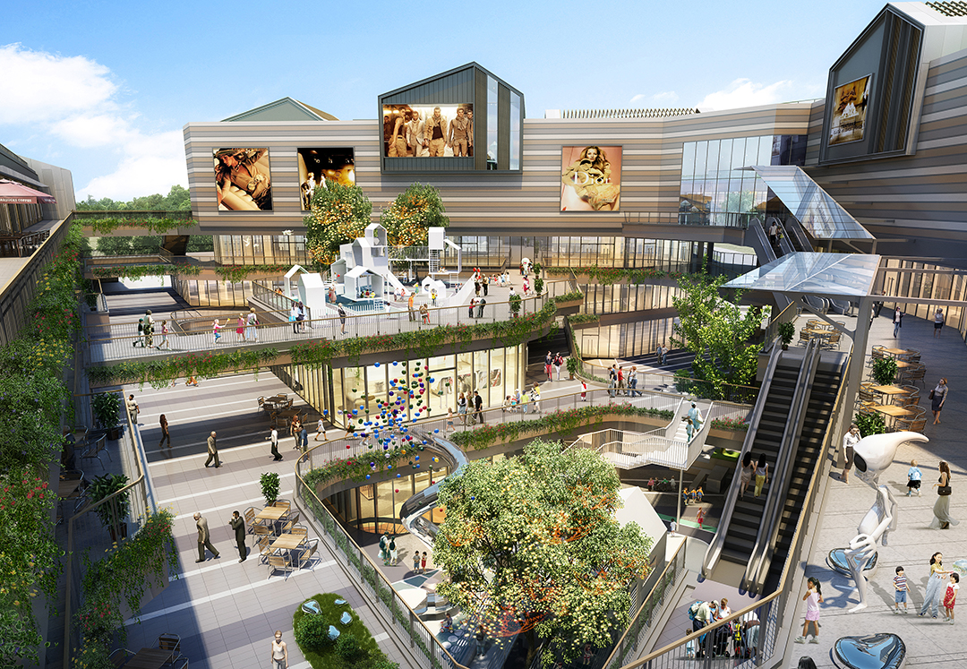 多入口在不同方向與層數(shù)都滲透融合,商業(yè)中段的入口廣場偏向流動性,采用連貫的景觀化綠植連廊,以及沿街豐富的梯臺綠化,生態(tài)的購物體驗油然而生。