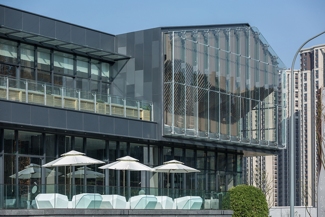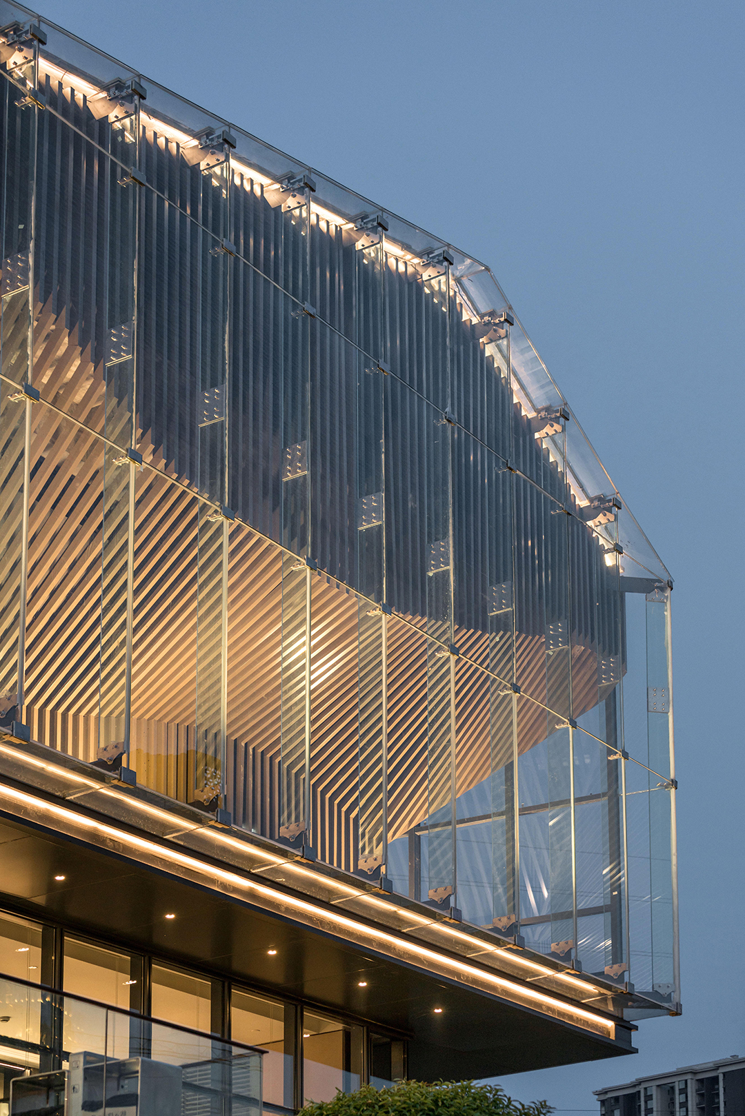 每一個局部在形式上塑成母題上的統(tǒng)一,在通透的超白玻璃后面,水的曲線,利用木格柵抽象的表達,它與整體是具有創(chuàng)造性的有機關(guān)系。