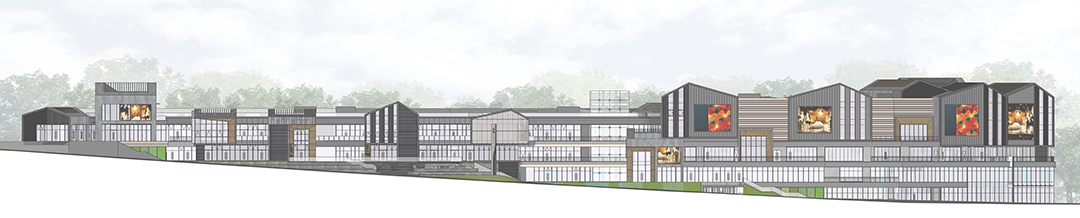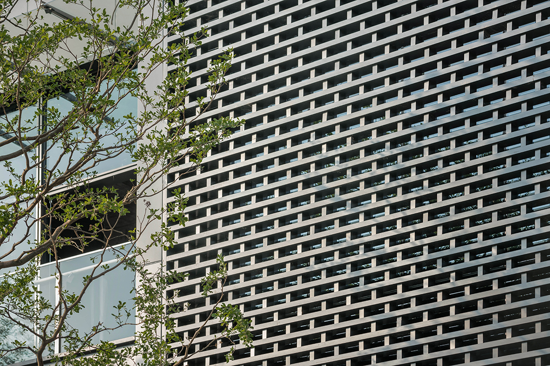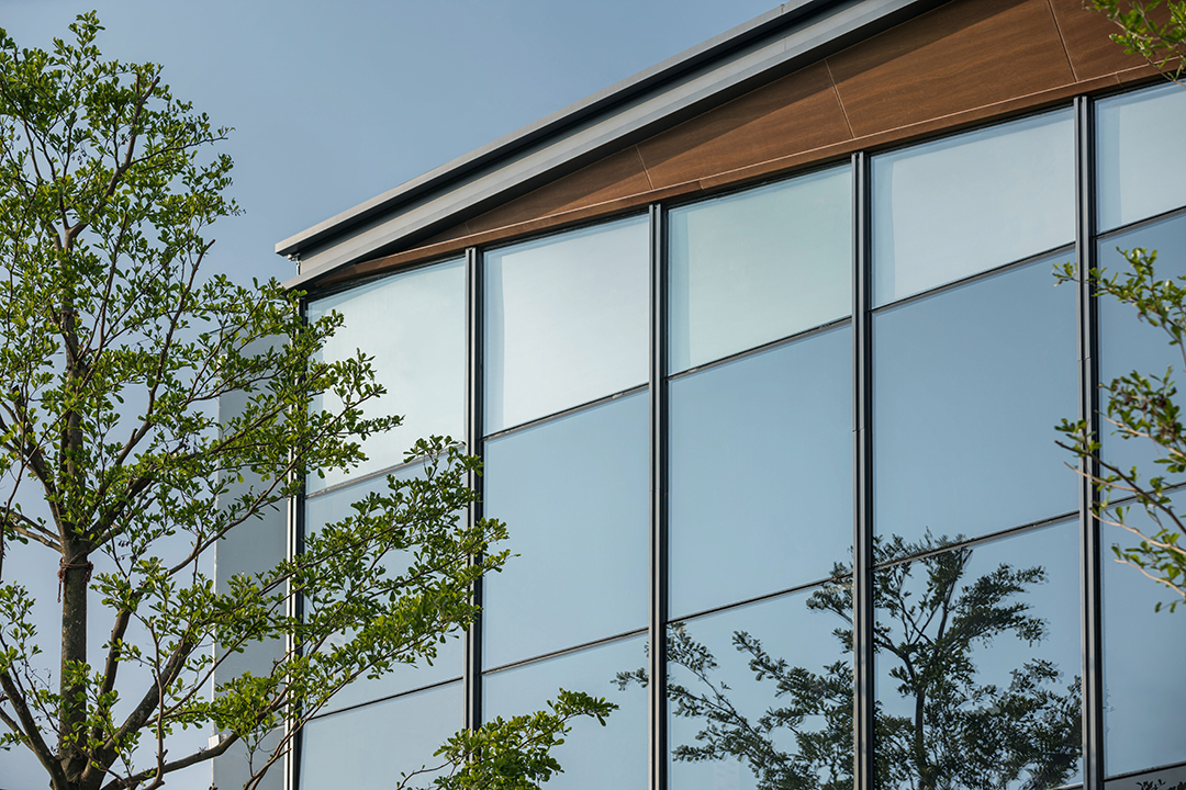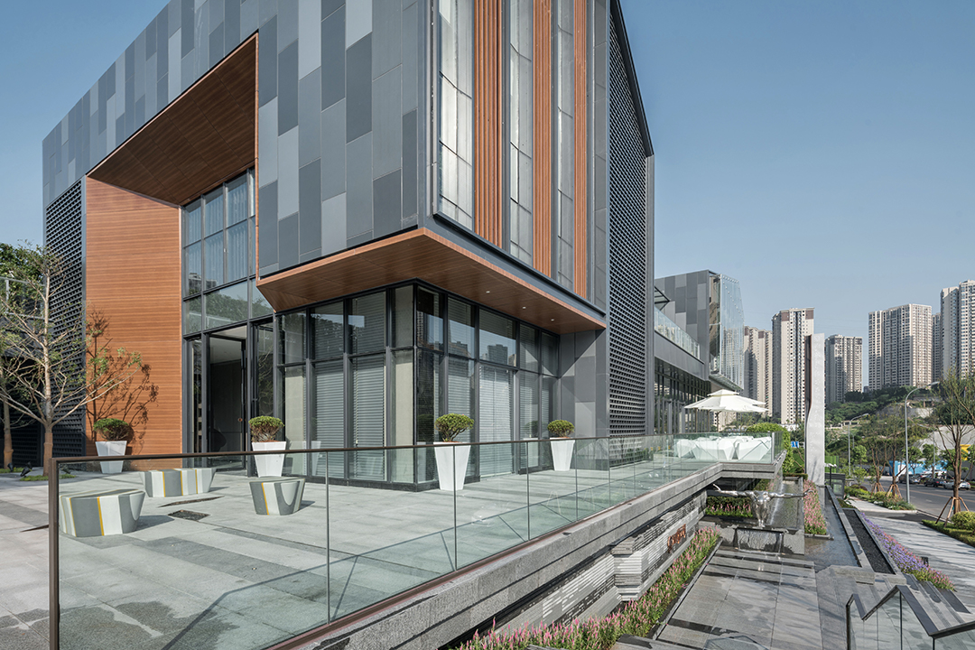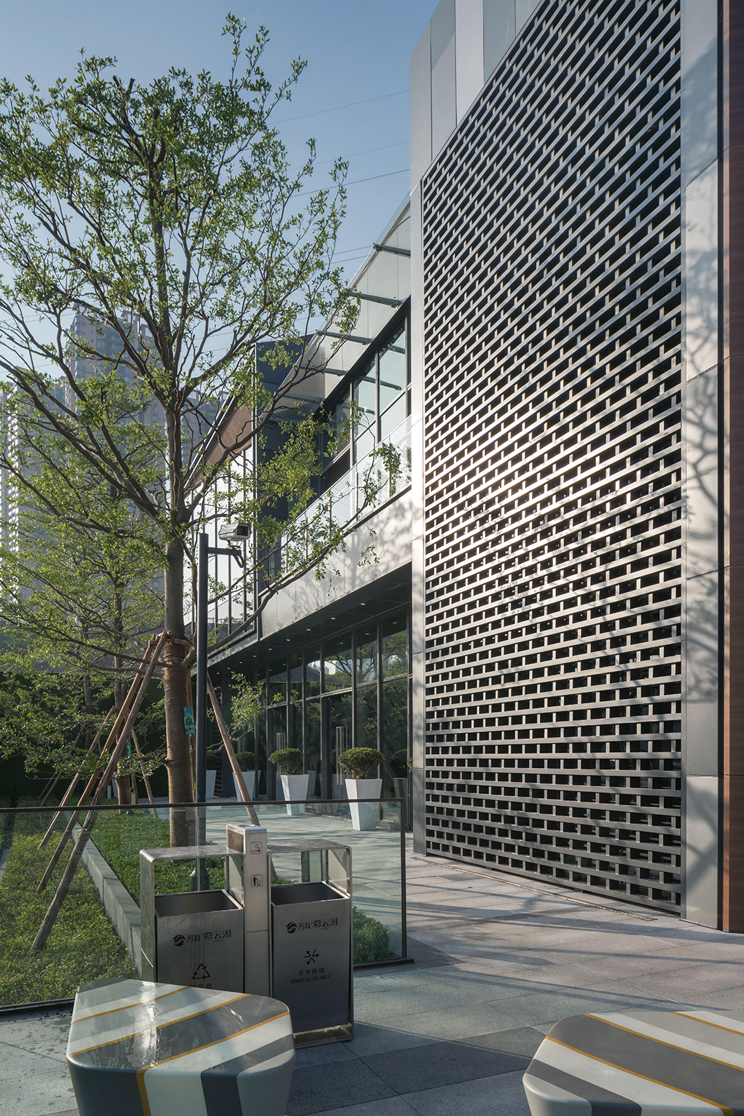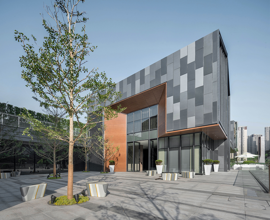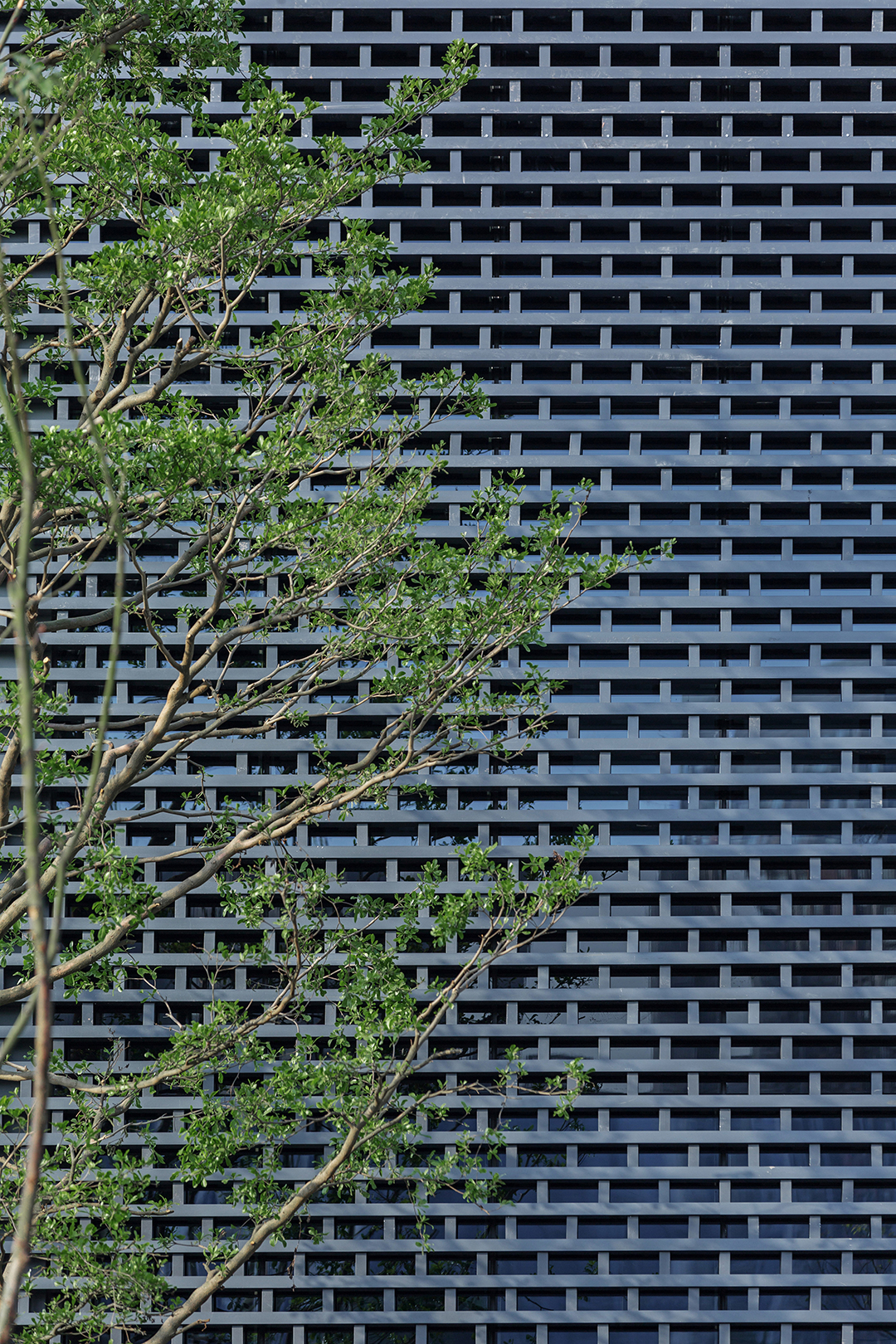 拼色鋁板是森林抽象的表達,模擬各種樹木的穿插與錯落感,有高有低,有深有淺。豐富了立面的材質(zhì)肌理,又能與體量和尺度共棲。