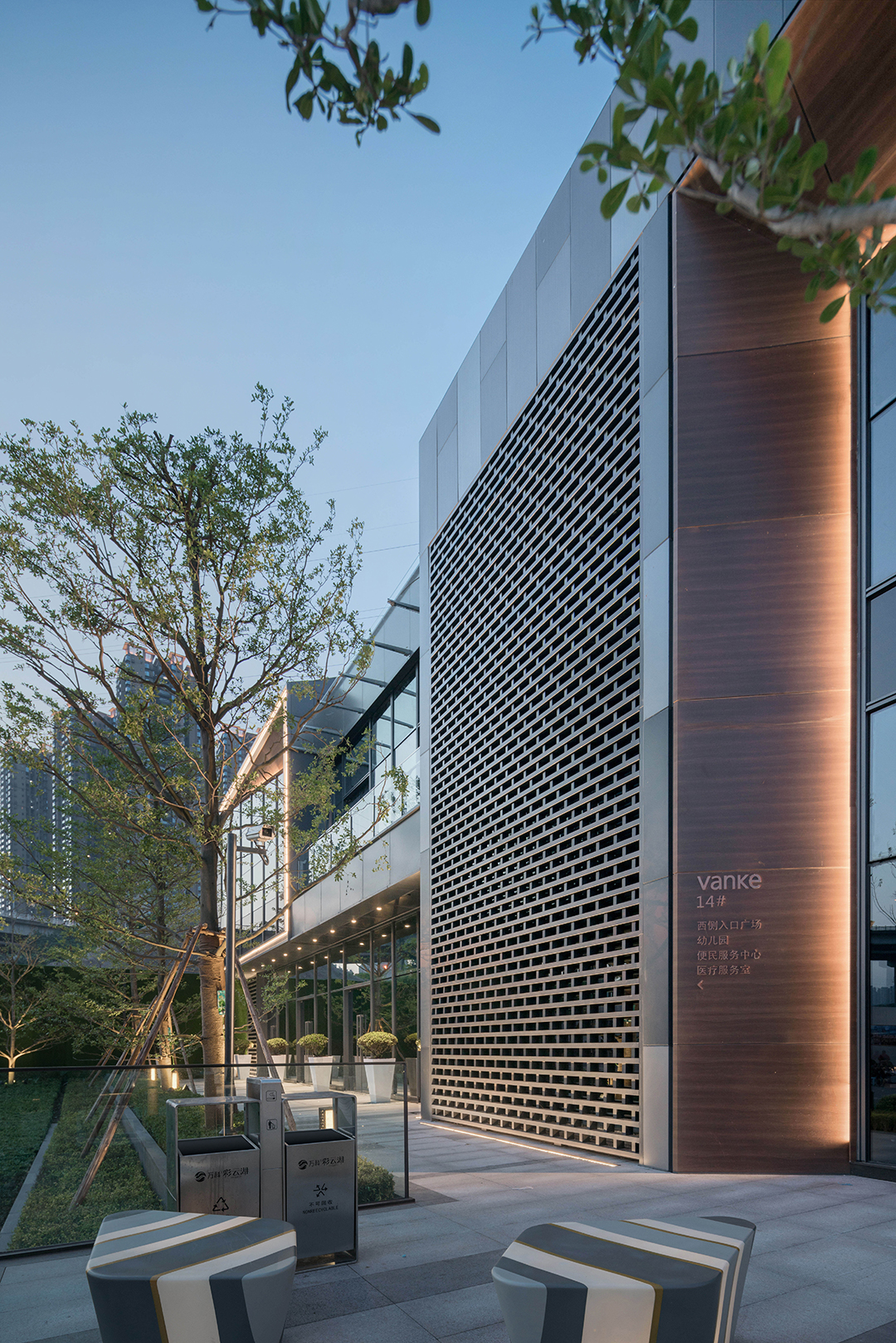 東側(cè)為集中商業(yè)主要形象入口,主入口位于建筑轉(zhuǎn)角,擁有更為廣闊的城市展示角度,形態(tài)上折面內(nèi)收,有納入之感,焦點式的穿孔鋁板肌理宛若面紗具有通透性,以開放的姿態(tài)將人流引入中庭。