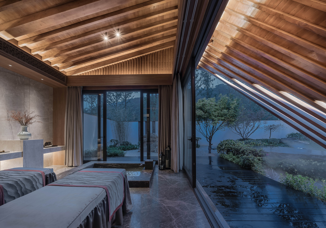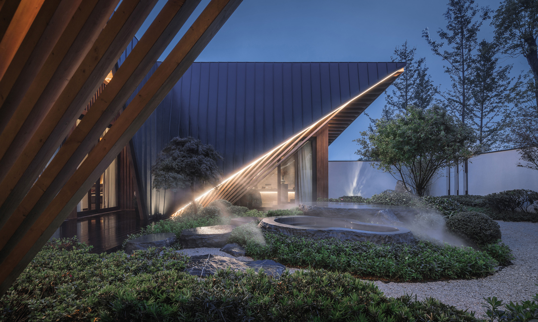 整個(gè)建筑空間層層漸變,屋頂高度根據(jù)功能空間的不同而變換,SPA作為最為私密的空間,屋頂落低,但動(dòng)與靜互為補(bǔ)充,相輔相成。