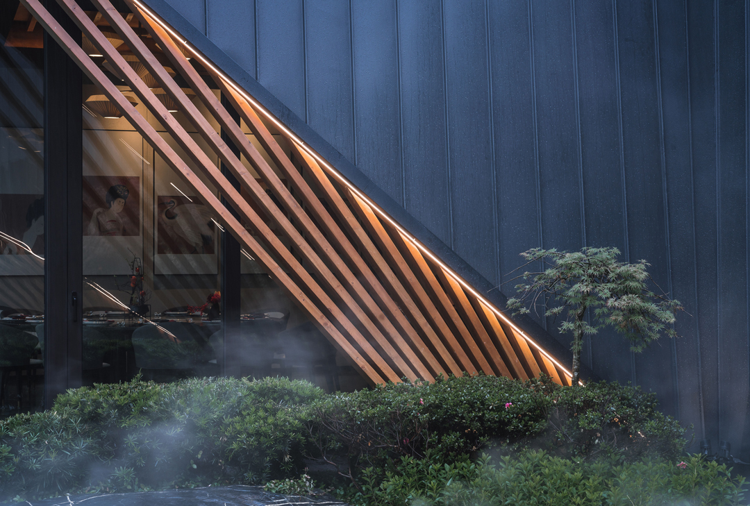 用玻璃與木格柵分割室內(nèi)外空間,引導(dǎo)視線,借以北側(cè)遠(yuǎn)山,分別形成三面框景。無聲、有光、有影,建筑元素越是接近世界的本原,人越能與空間產(chǎn)生共鳴,皆在營(yíng)造鬧中取靜的空間氛圍。