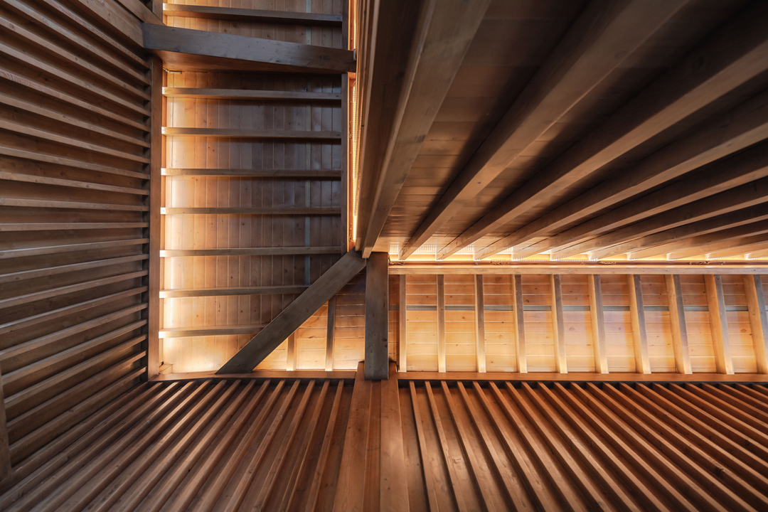 設(shè)計(jì)師充分尊重和保持材料的本質(zhì),利用木材這種天然材料,保證了建筑的“原色性”。外露的膠合木結(jié)構(gòu),以素面處理,表現(xiàn)出清晰的木質(zhì)紋路及柔和自然的光澤。小巧的木構(gòu)件尺寸不同于其他的大型木構(gòu)項(xiàng)目,將材料“粒子化”的手法,細(xì)化成模數(shù)作為建筑的組成。