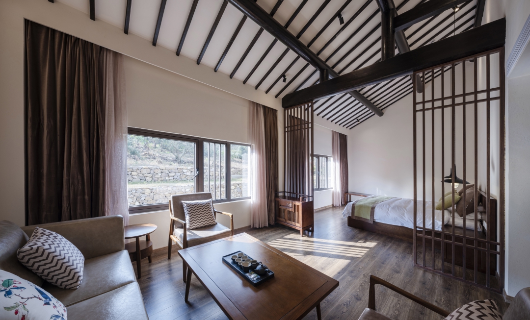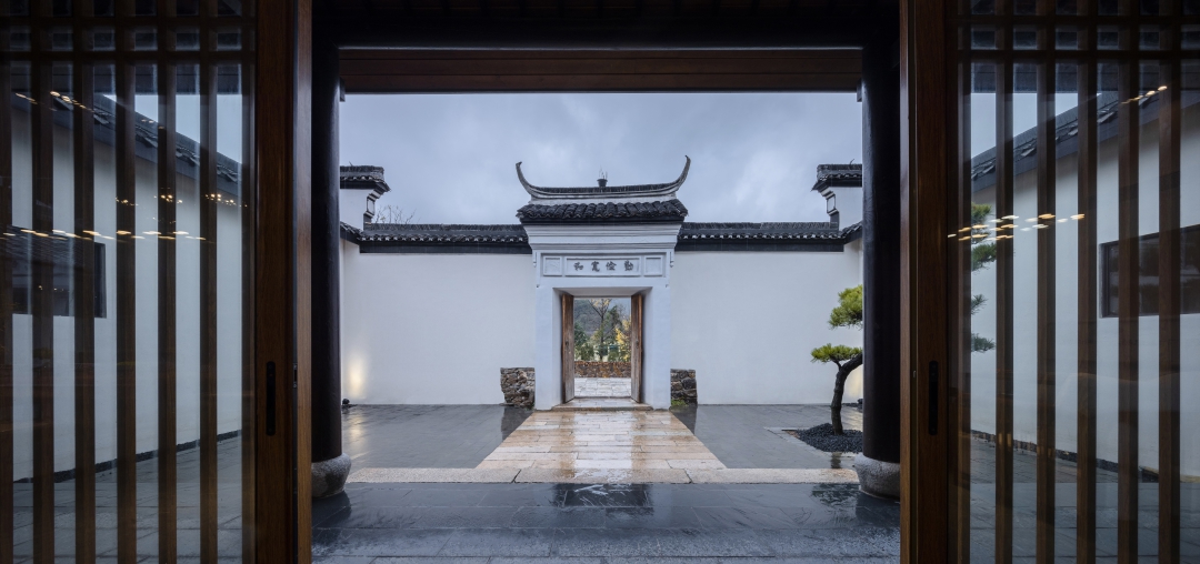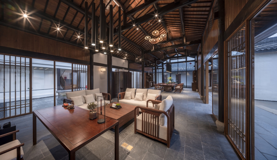 大堂由大幅落地窗與玻璃門圍合而成,以現(xiàn)代手法重構(gòu)通透的視覺效果,庭院的四季變化盡收眼底。即保持了傳統(tǒng)民居的符號(hào)又體現(xiàn)了現(xiàn)代建筑的融合性和一致性,也是地域文化、鄉(xiāng)土文化的一種回歸方式。