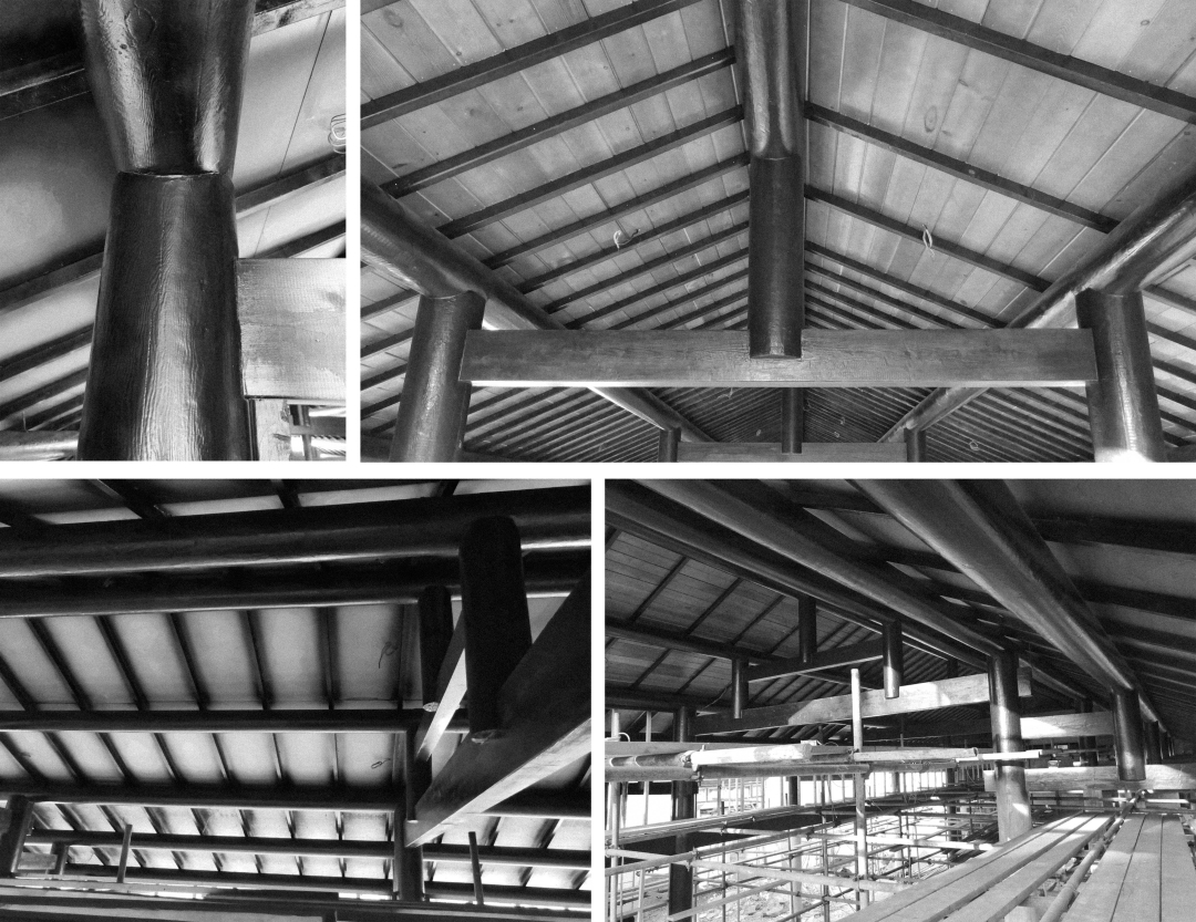 木結(jié)構(gòu)是歷史產(chǎn)生的瑰寶,蘊(yùn)含很重要的歷史和文化價(jià)值,穿斗式木結(jié)構(gòu)又是中國(guó)傳統(tǒng)建筑中最重要的結(jié)構(gòu)形式之一。拆下來的舊木料、舊磚瓦、花瓶式柱礎(chǔ)都被重新被利用,老宅內(nèi)的古樹根據(jù)景觀布局進(jìn)行移植栽種。這次的復(fù)原,運(yùn)用了現(xiàn)代木結(jié)構(gòu)技術(shù),使用鋼構(gòu)連接件替換了傳統(tǒng)的技術(shù),受力可以參與參數(shù)化計(jì)算,結(jié)構(gòu)整體更加穩(wěn)定及持久。
