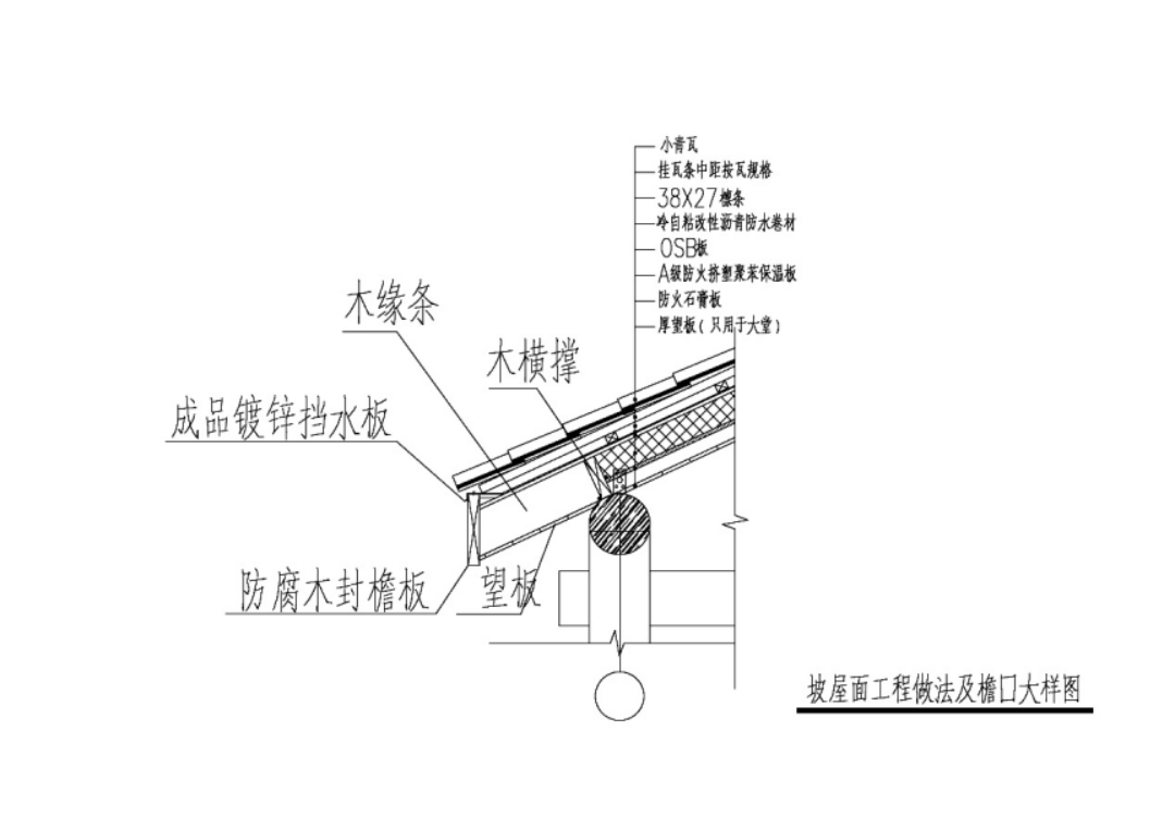 木結(jié)構(gòu)坡屋面采用掛瓦方式,在傳統(tǒng)的掛瓦節(jié)點(diǎn)的木椽條間充填防火保溫層,增加建筑保溫性能,優(yōu)于國(guó)家節(jié)點(diǎn)要求。并在檐口部分增加泛水板,更好的保護(hù)了木結(jié)構(gòu),大大增加了木構(gòu)的使用壽命。