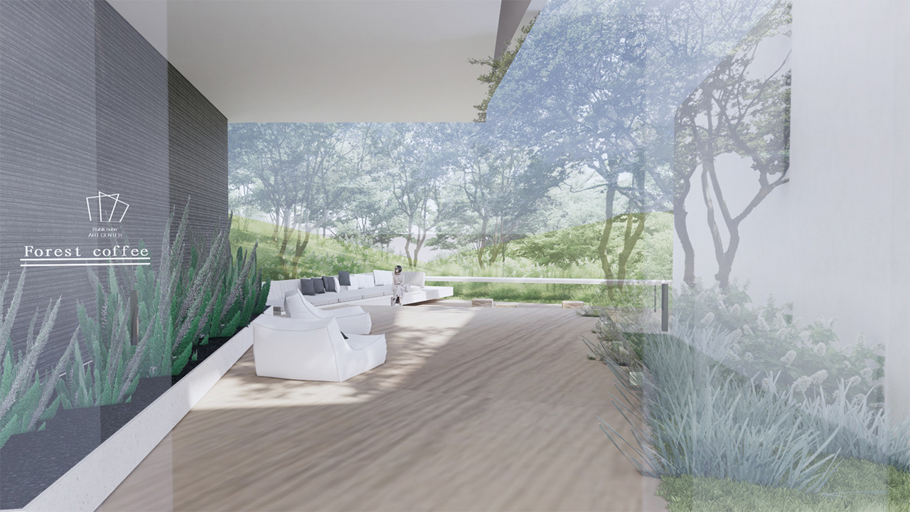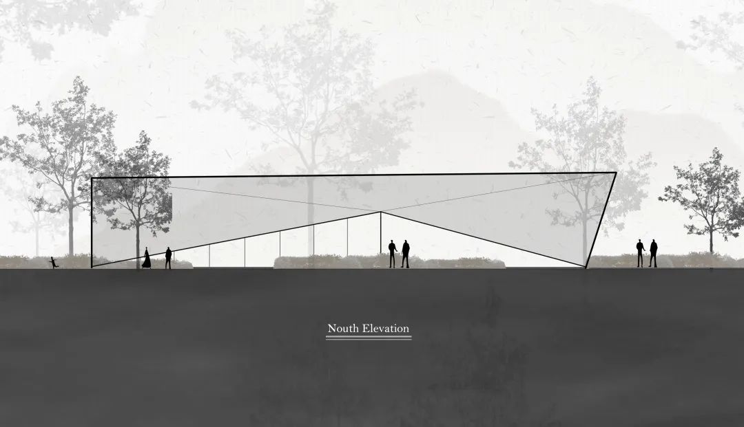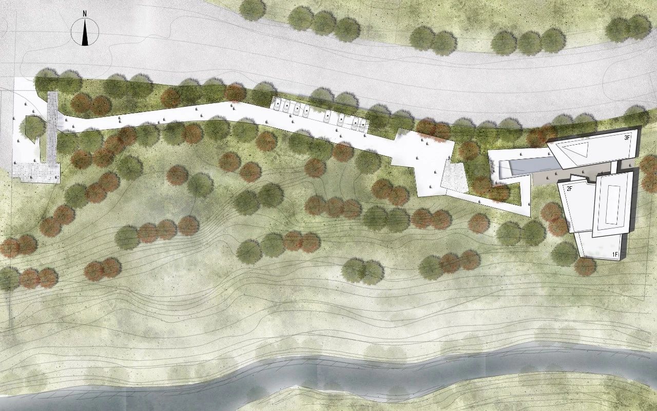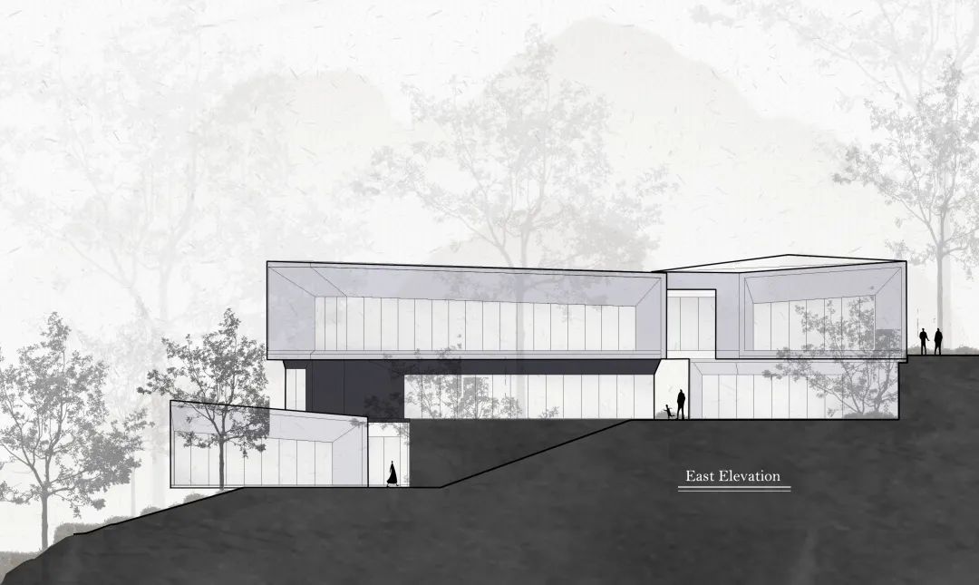 建筑的最底層,為營造出輕盈飄逸的形態(tài),運用懸挑的方式將建筑與山地分開,盡量少的讓建筑介入山體,減少對山地的破壞。設計師希望施工幾年后,植物開始茂盛,建筑將成功的消失在環(huán)境中,這里只有關系存在,沒有形狀存在。建筑周邊種植草坪,人們很容易走上去,建筑造型與地形相結合,也方便舉行各種集體活動。