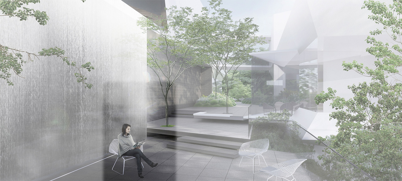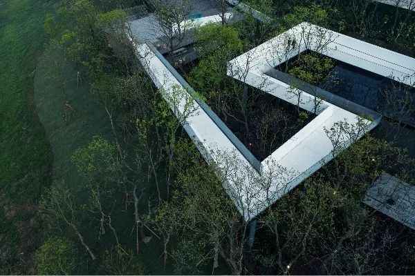 利用拓撲幾何學將五個盒子疊加于山坡之上,通過體塊的扭動實現空間的交錯,并形成若干個空中庭院。游人從曲折的景觀長廊一路走來,建筑被樹木包裹,若隱若現。時間、空間和物體被融合到建筑中,人們通過視覺和觸覺等知覺綜合,將在光線、陰影、縱深、質感以及色彩中得到了一種獨特的建筑體驗。