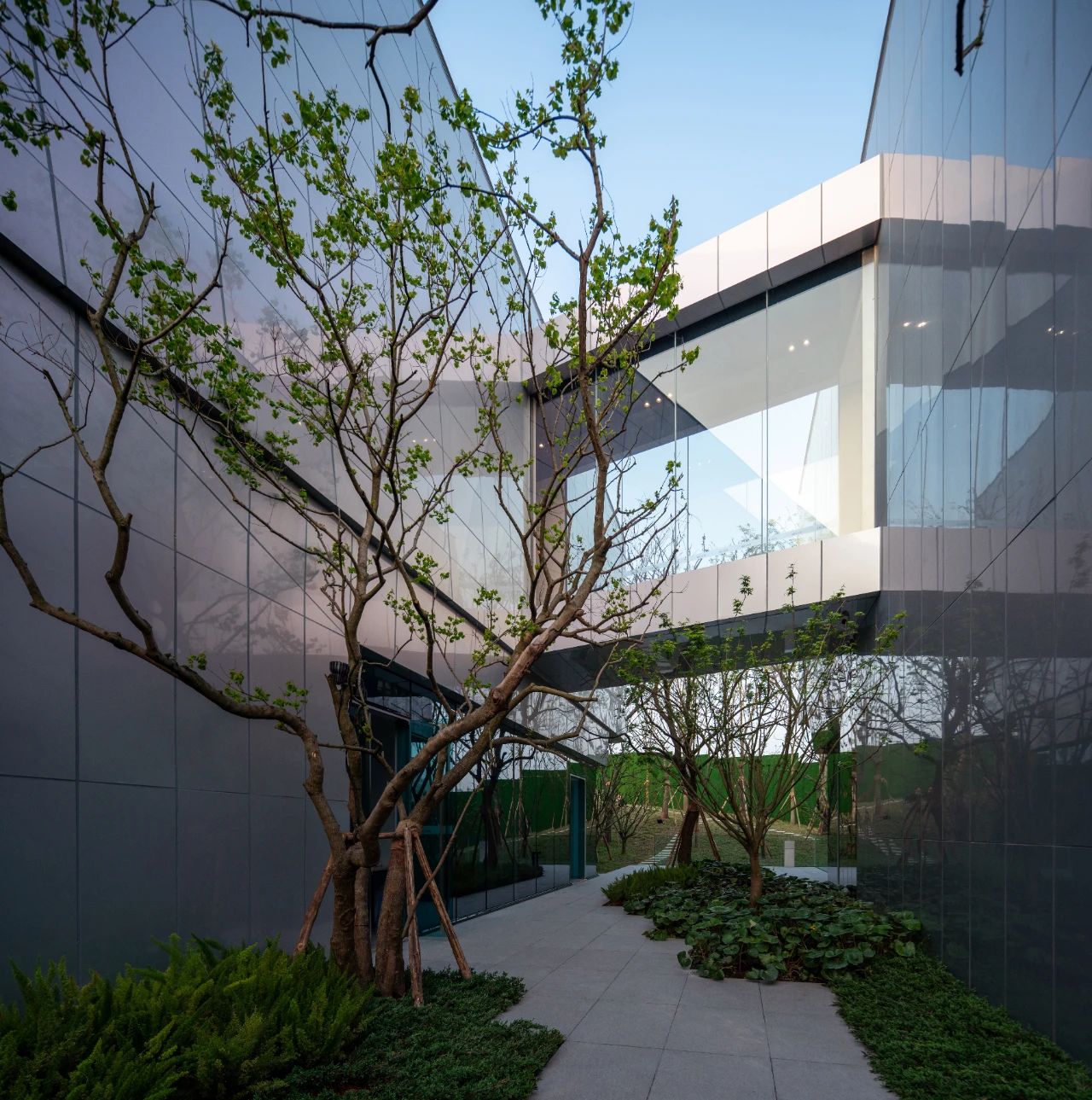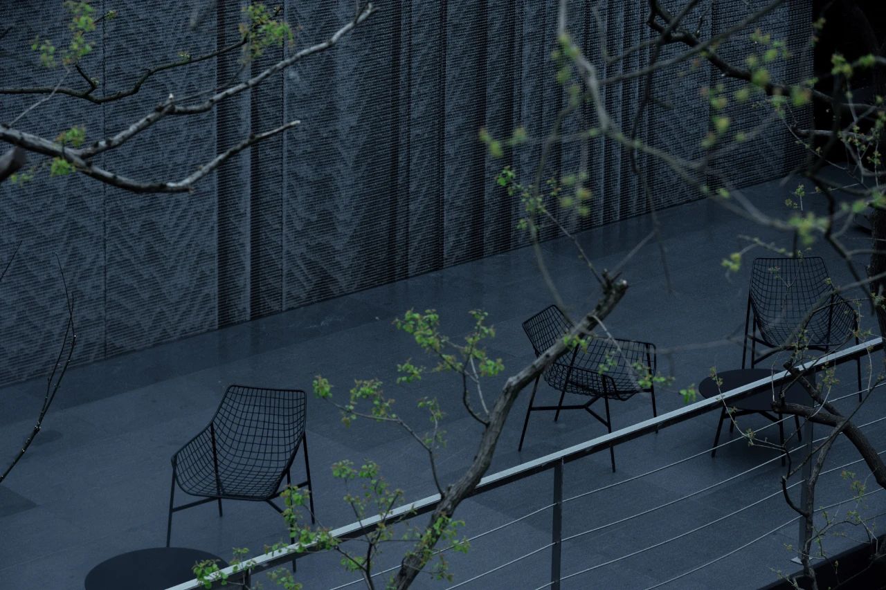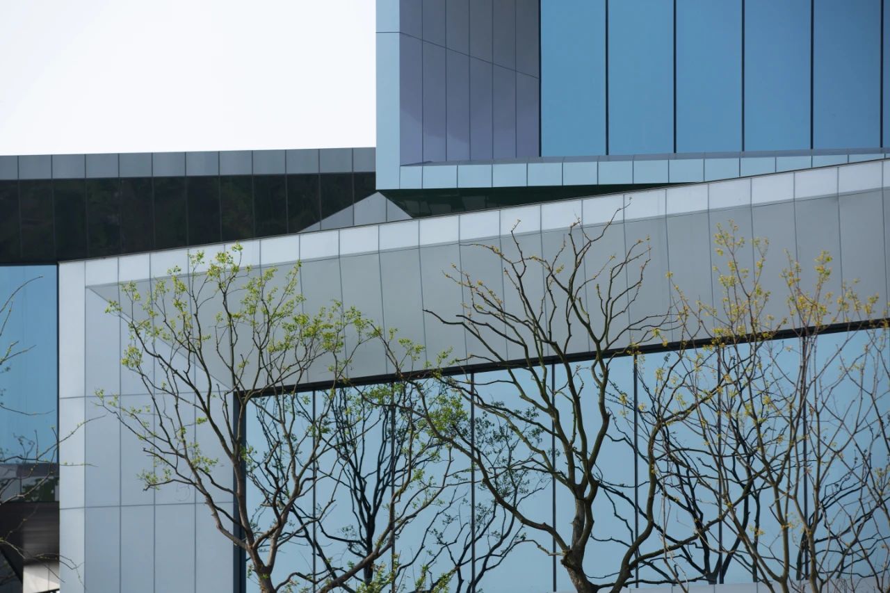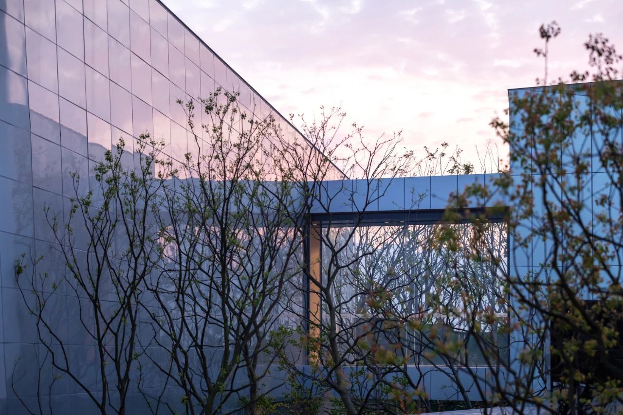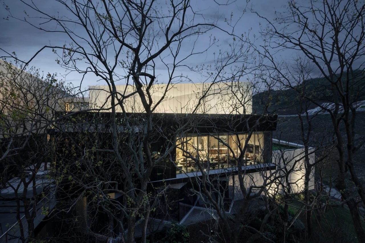 山地建筑設計與場地密不可分,其實質也是追求人與建筑、自然三者的和諧關系。位于上部的三個盒子表皮運用幻彩鋁板,使建筑純潔干凈,但隨著時間流動光線變幻,表皮的顏色也隨之變化,成為建筑表情的有效調節(jié)劑。位于底部盒子設計為黑色鏡面鋁板,匍匐并消隱在山坡之上。金屬表皮映襯著光影下的婆娑樹枝,不再沉悶和堅硬,而是以柔和輕盈朦朧的形象展現在眼前。表皮、空間與光線之間建立了良性的對話,以一種婉約的形式與外部空間聯為一體。