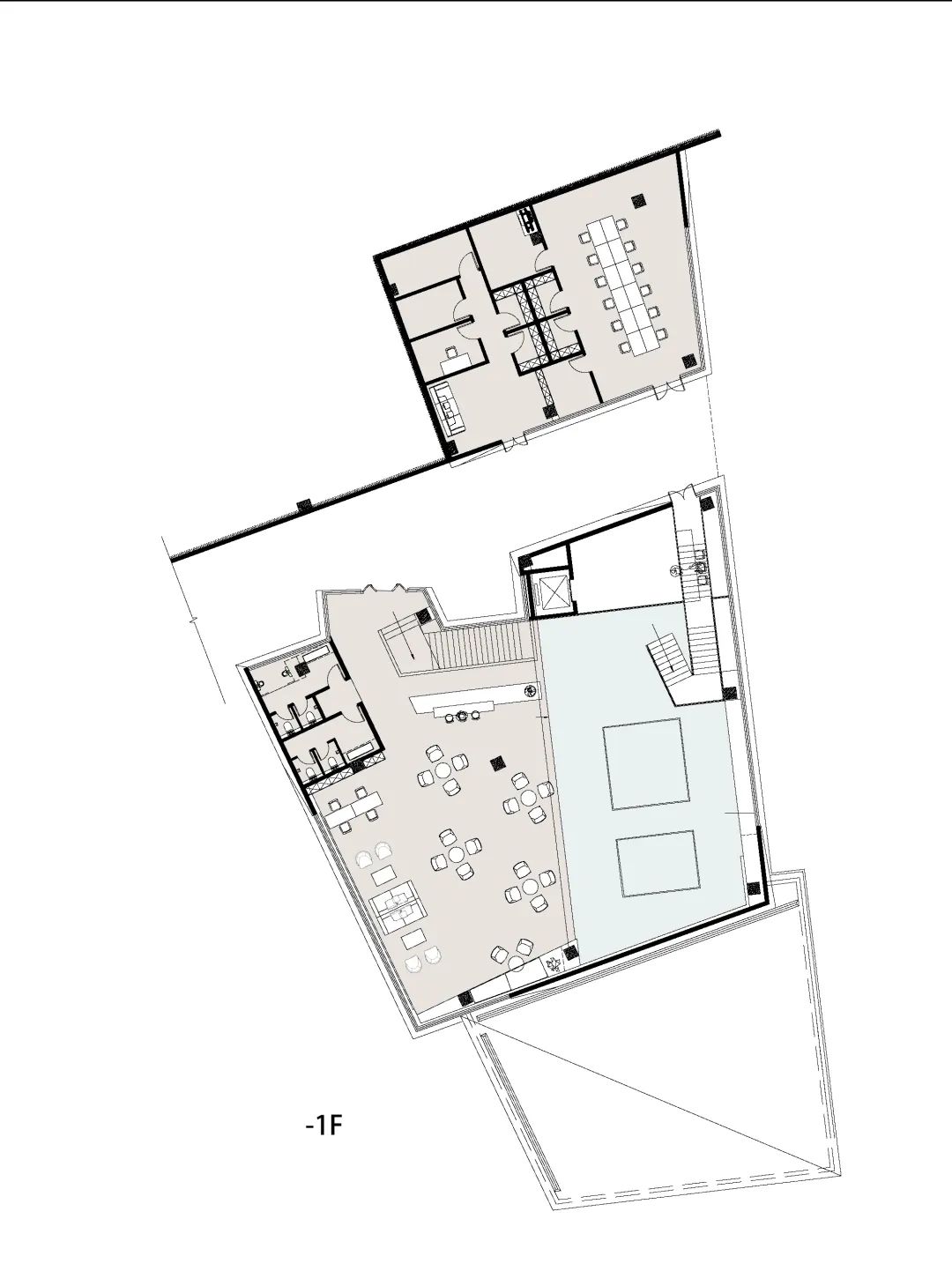 折疊形成的庭院,使內部空間秩序不再固定,在流動的空間中,空間互相穿透與交融,界限曖昧模糊。建筑內外相互流通,個體空間的形態(tài)也退而求其次,讓步于整體的空間關系。建筑空間具有連續(xù)性,形成一種漫游。
