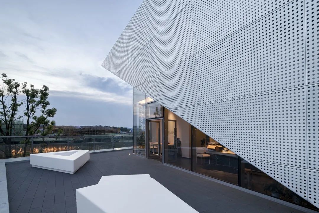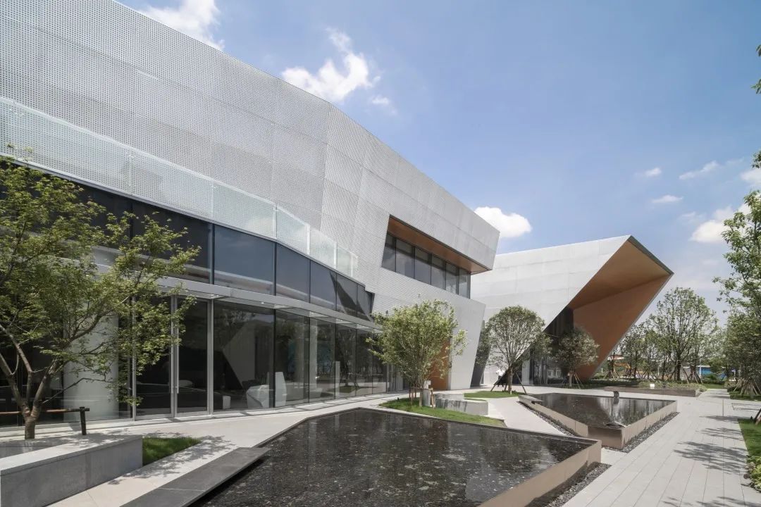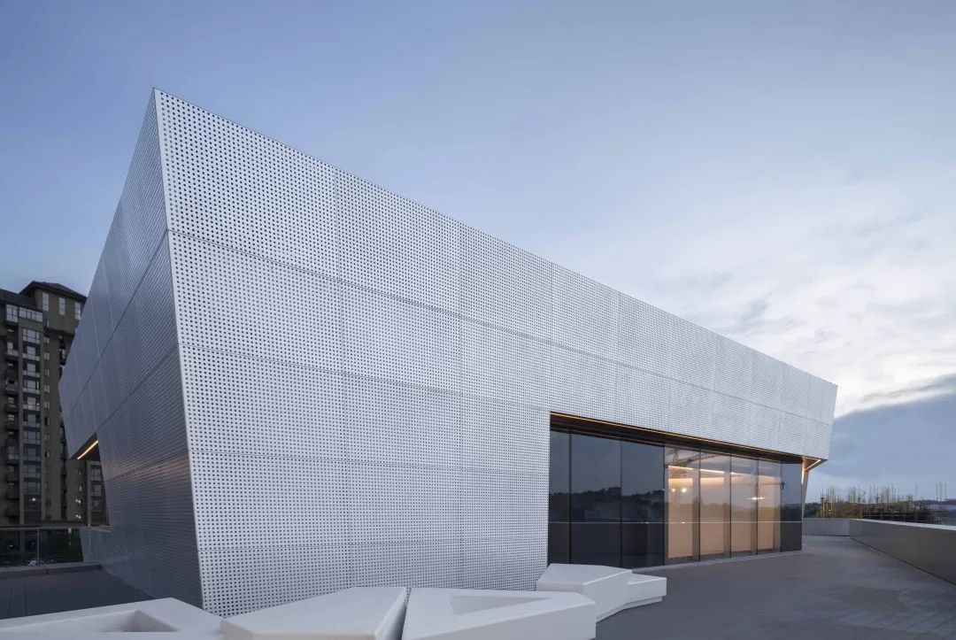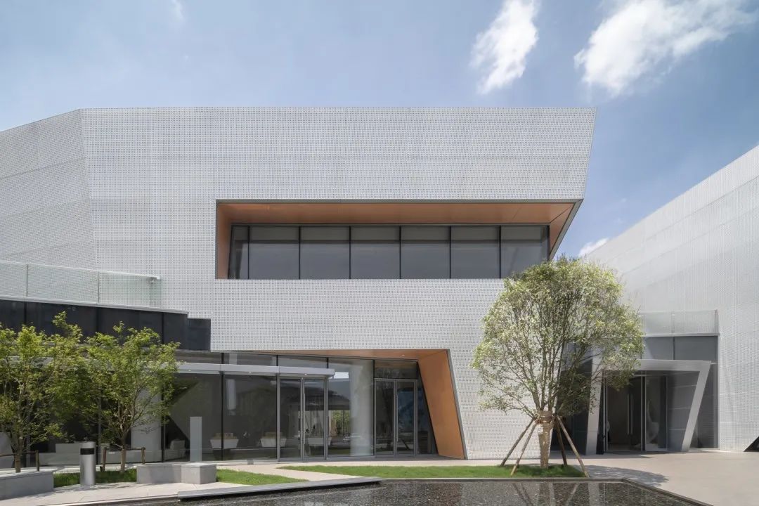 通過對體塊的切割,形成前衛(wèi)現(xiàn)代的建筑形體。大面積穿孔鋁板、仿木紋鋁板和玻璃體塊的結(jié)合,使得整體形象極富張力和工業(yè)美感。