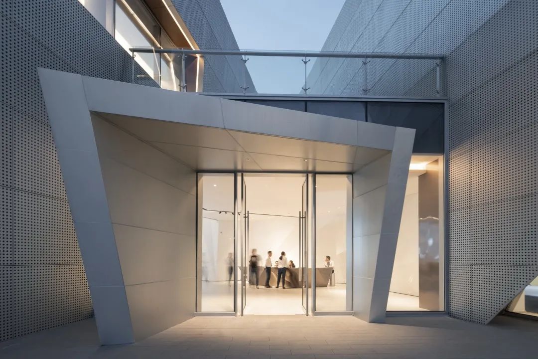 為了在夜晚照亮周界與廣場,將建筑通透的玻璃面置于一層,實體的金屬面置于二層,激活了內(nèi)外部的行人體驗。立面上僅使用3種建筑材料,純凈表皮最大化展示形態(tài)美。