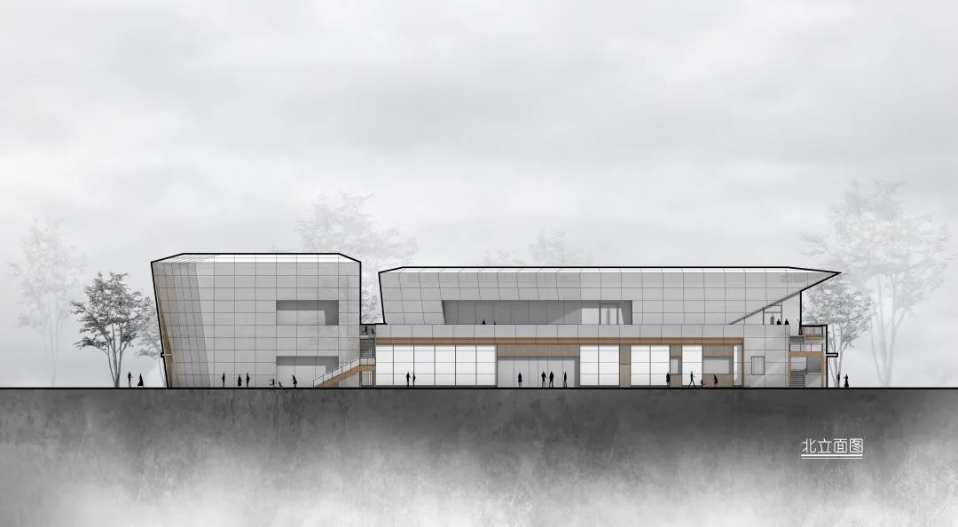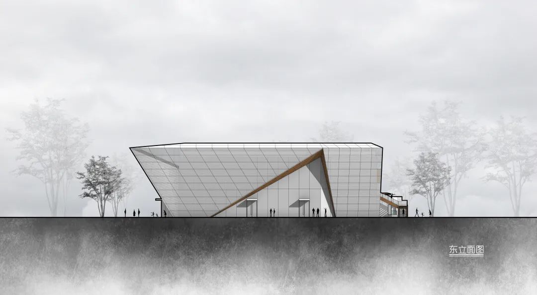 在二樓兩個體塊間預(yù)留預(yù)留露臺空間,來訪者可以到達建筑的屋頂露臺,從而欣賞萬豐湖濕地公園的全景風(fēng)貌。并于露臺預(yù)留架設(shè)天文望遠鏡的空間,游客可于此仰望滿天繁星。