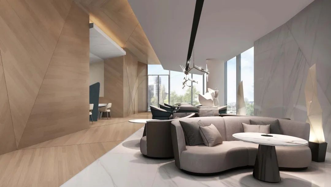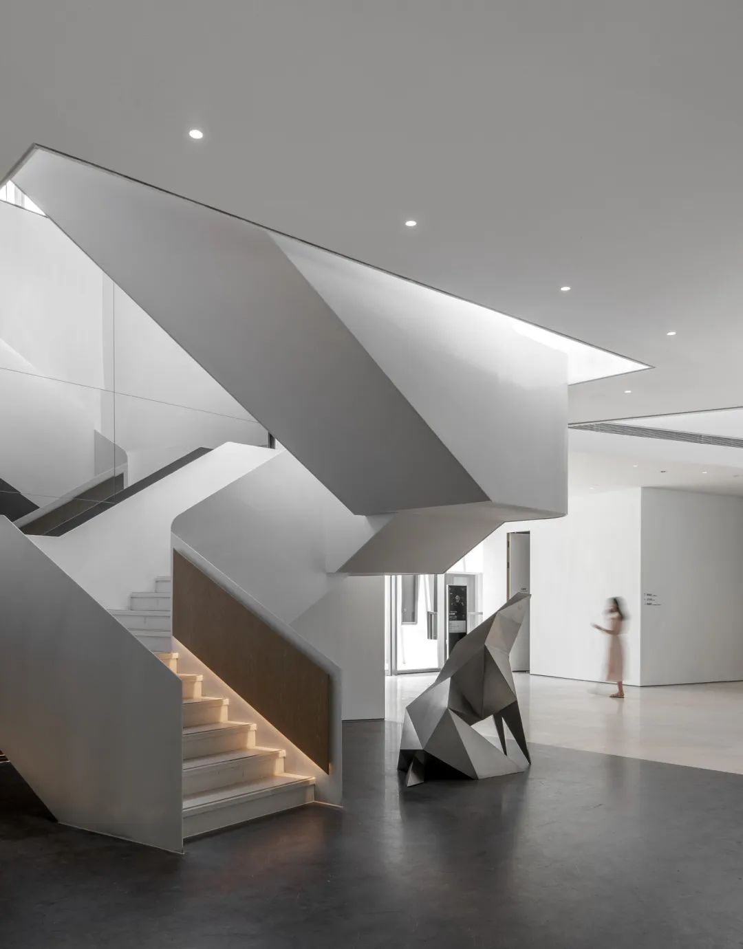 幾何轉(zhuǎn)折的玻璃面、不規(guī)則的折線旋梯,與建筑整體風(fēng)格相呼應(yīng)的同時,帶來藝術(shù)感和科技感完美結(jié)合的室內(nèi)空間。