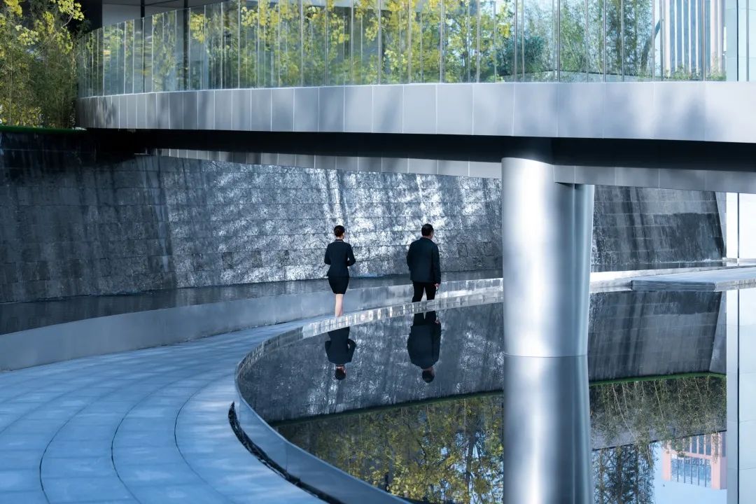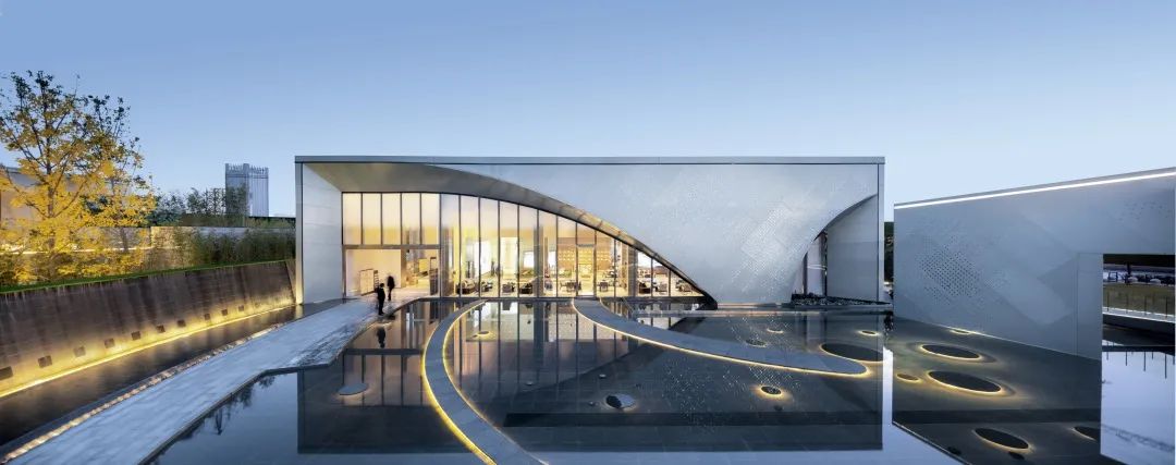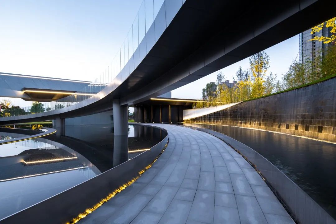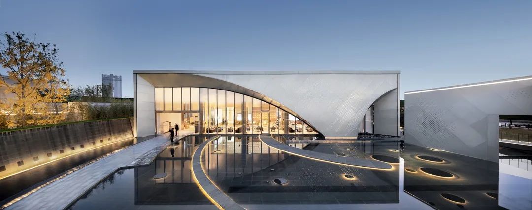 空間與視覺的連續(xù)性:立面的墻體通過藝術(shù)創(chuàng)作產(chǎn)生視覺上的肌理感,將光與影帶入到空間中,微風(fēng)拂過水波倒影連廊起伏,層層漣漪之上倒映出朦朧的樹影與建筑。運(yùn)用玻璃等半透明材料,舒朗別致的造型結(jié)構(gòu)打破景觀與建筑的界限,打造空間與視覺的連續(xù)性與純凈性。