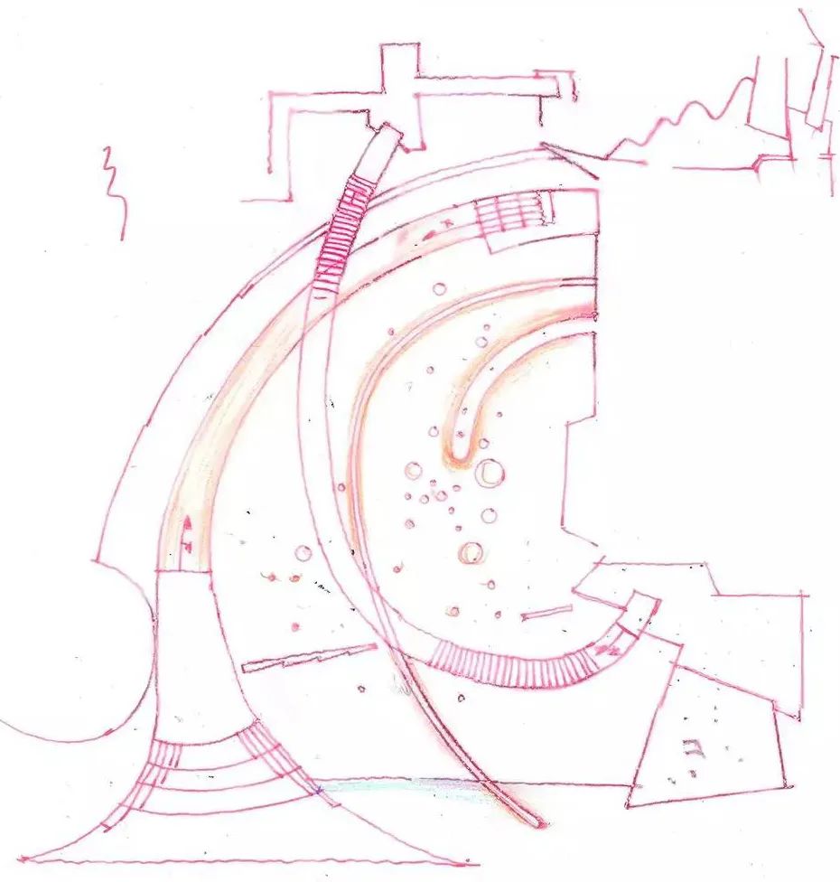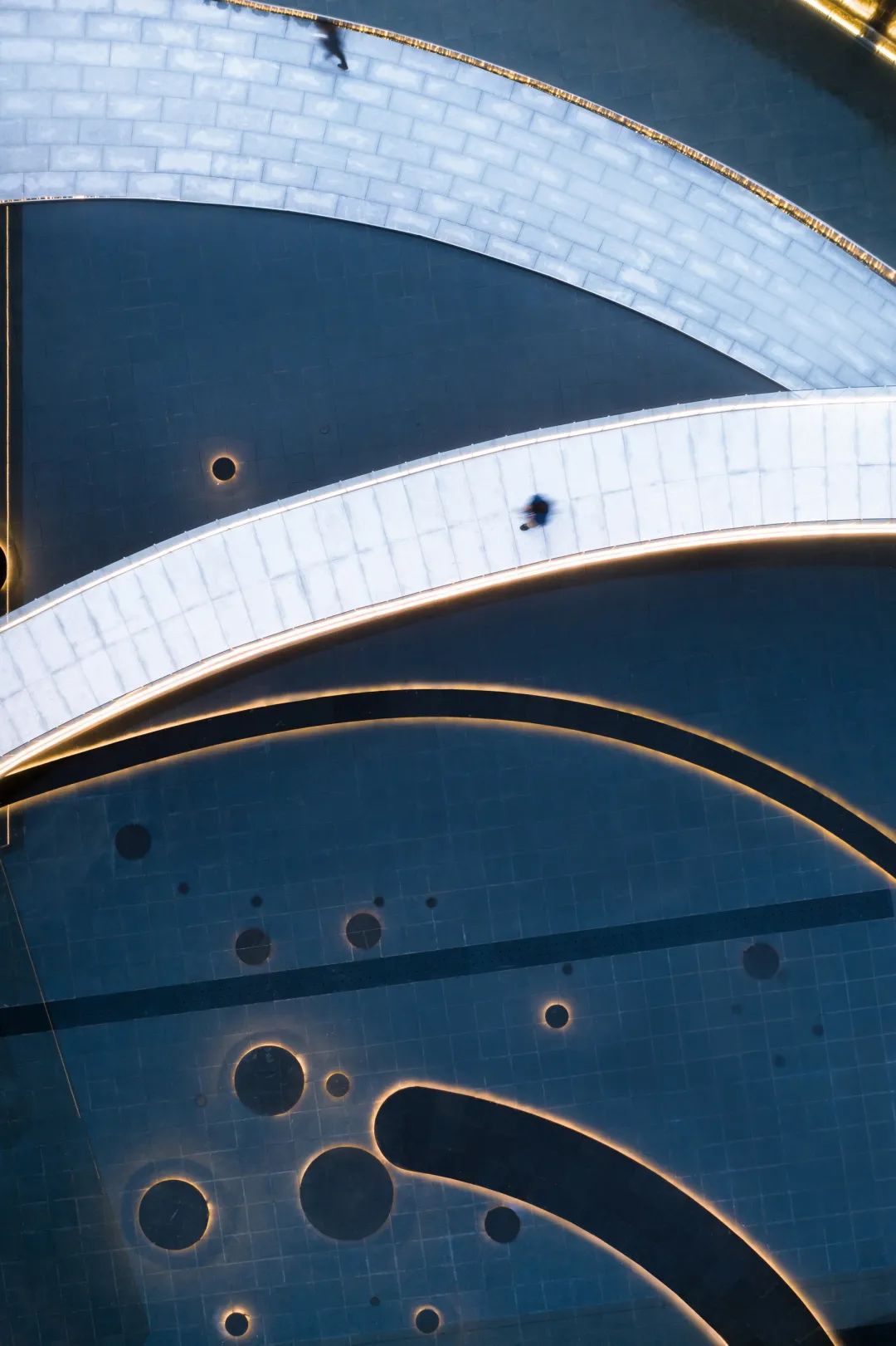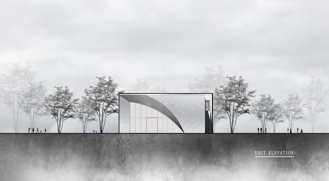 曲線形和方形的空間,與景觀的廊橋相互回應(yīng)。建筑立面的曲線與景觀廊橋的曲線延續(xù)統(tǒng)一,這是一條隱性的認(rèn)知流線——向上、向內(nèi)、向光,懸隔日常,劃過銀河,回歸自我。