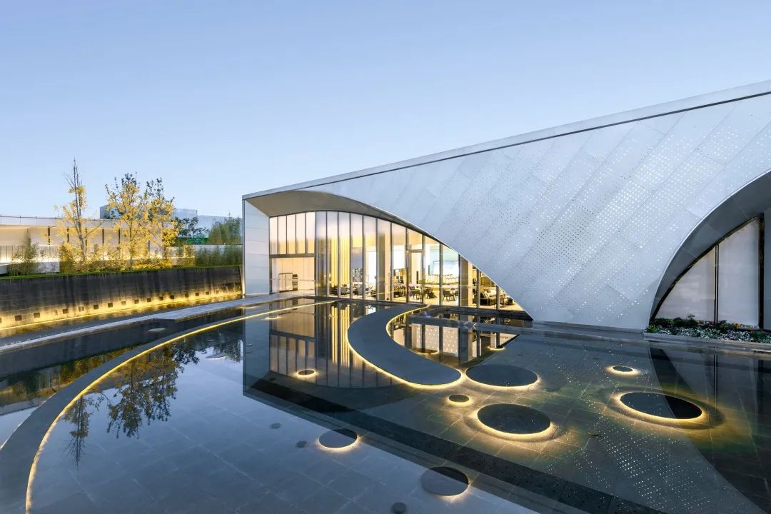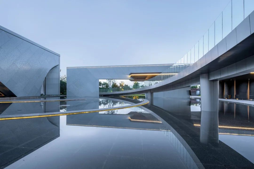 獨(dú)特的示范區(qū)入口門頭設(shè)計(jì),三角形交錯(cuò)切割搭的頂蓋搭配弧與圓變形拼接的墻體,選用與建筑表面相同的鋁板材質(zhì),讓每一個(gè)到訪的客戶都能體會(huì)到尊貴大氣的儀式感。大門整體框架為線條設(shè)計(jì)感十足的多邊幾何形,肆意張揚(yáng)的角,似無限延伸的線,百變的面富有動(dòng)感?!坝薄ⅰ熬邸?、“觀”一氣呵成。整體為黑白色調(diào),純粹簡約,同樣不缺少高級(jí)質(zhì)感。從內(nèi)延伸至外的水面,倒映著藍(lán)天白云,似天地顛倒闖入一片幻境,似夢(mèng)而非夢(mèng)。
