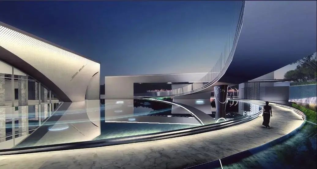 在示范區(qū)中構(gòu)建一座飛橋,兩側(cè)橋板采用半透明玻璃材質(zhì),整體形態(tài)以平滑曲線的設(shè)計(jì)方式連接售樓處和樣板房,增加了整個(gè)空間的層次感,在視覺上豐富客戶游覽體驗(yàn)感。漫步在飛橋之上,可以感受到自己是整個(gè)空間的主角,你就是別人眼中最美的風(fēng)景;行走在橋下,橋與一側(cè)的水幕墻結(jié)合,可以感受到一種空靈縹緲的意境。