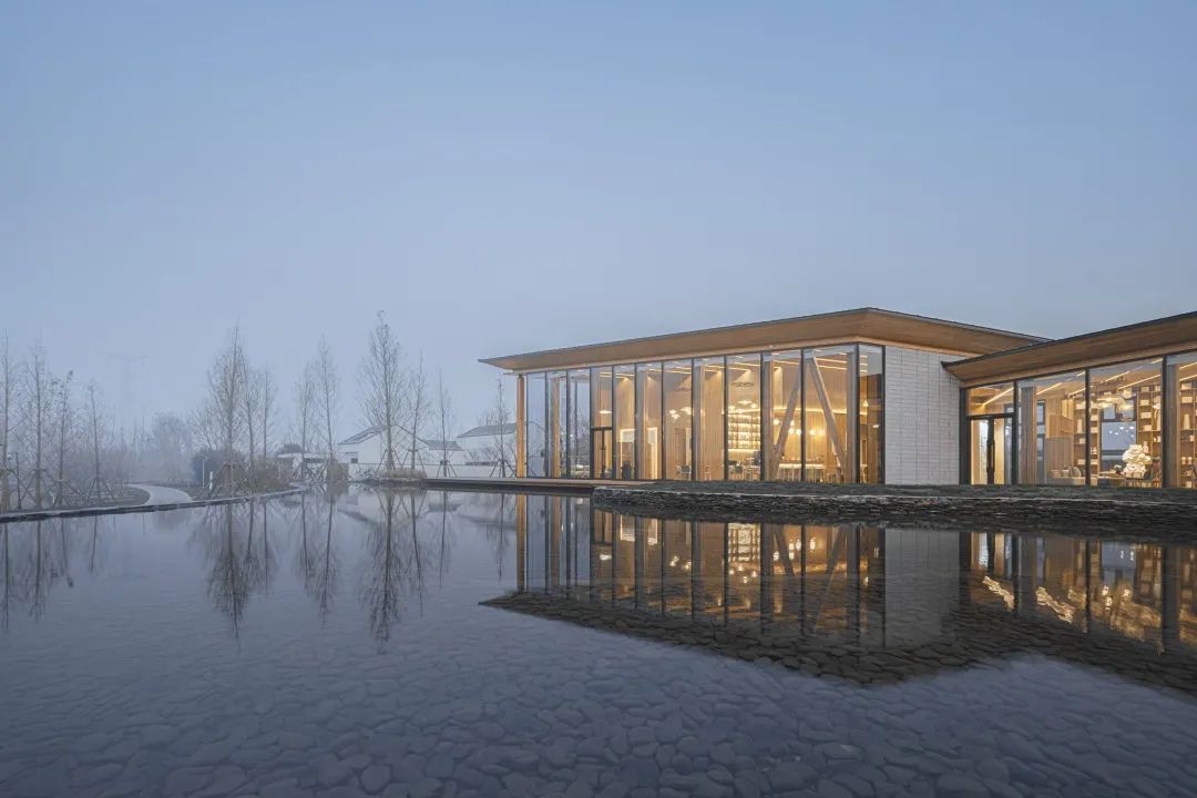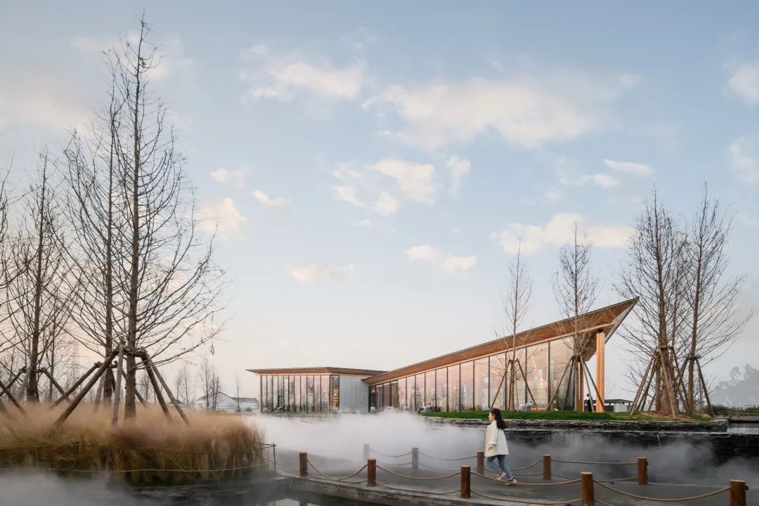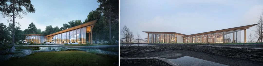 玻璃幕墻與木結(jié)構(gòu)坡屋頂是建筑的主要元素,它用輕巧的結(jié)構(gòu)定義了建筑的室內(nèi)特征,又在外部營造了極具識別性的形象。