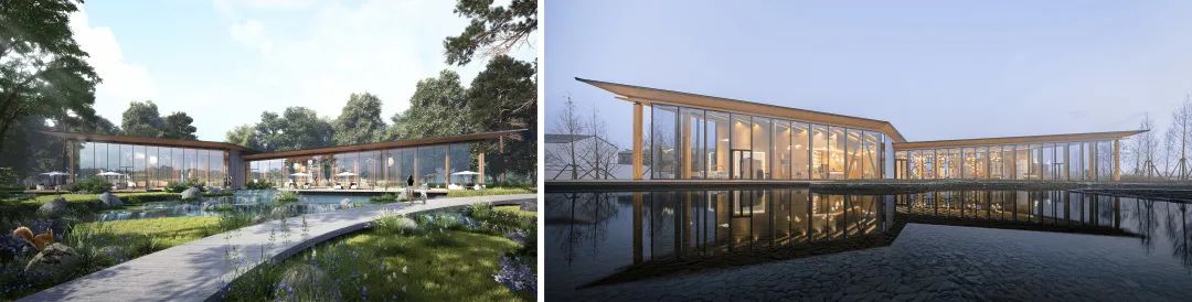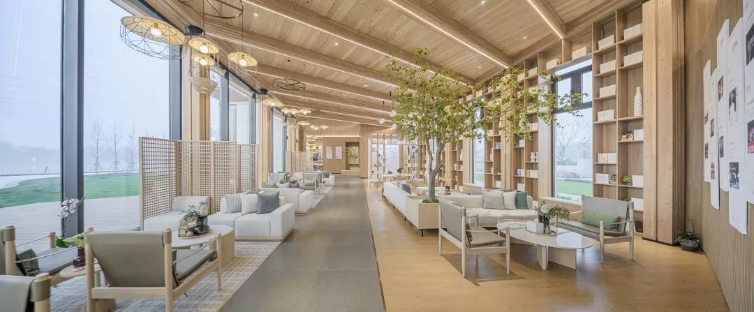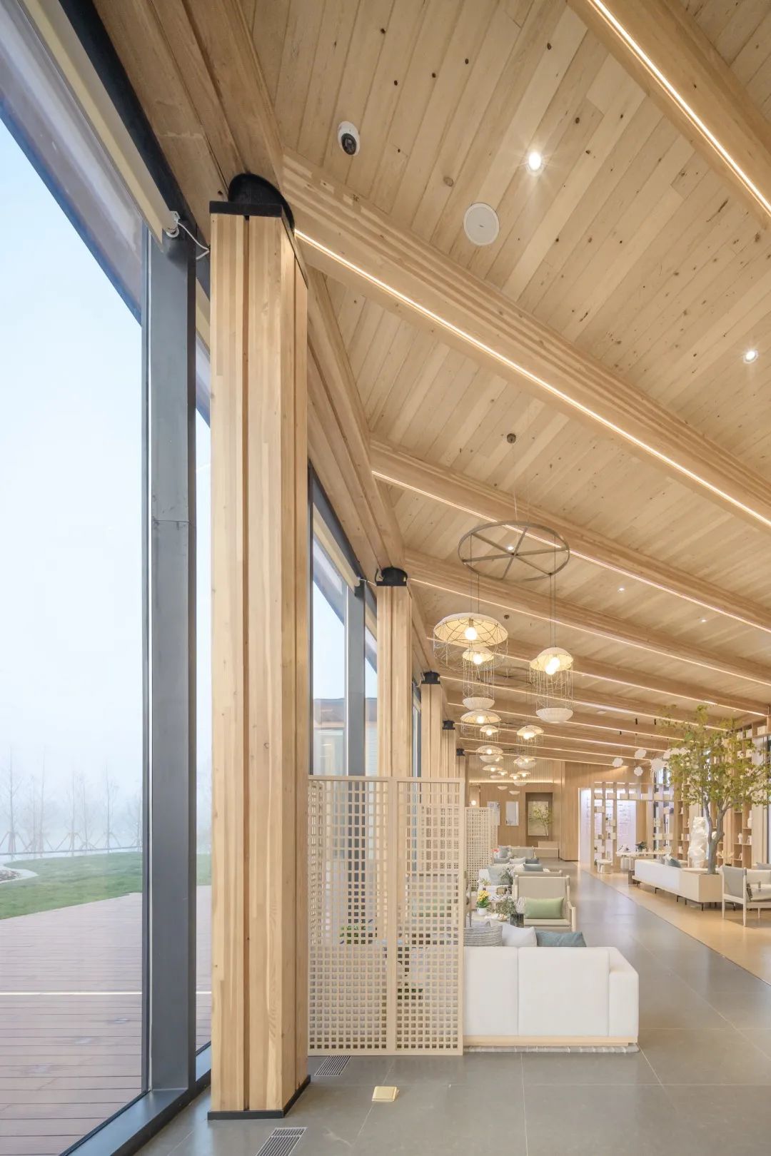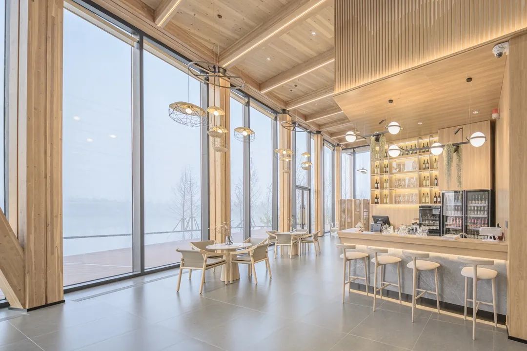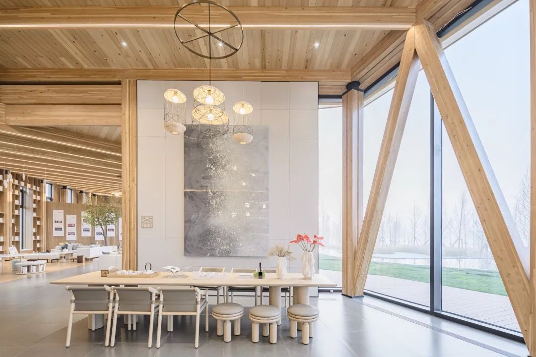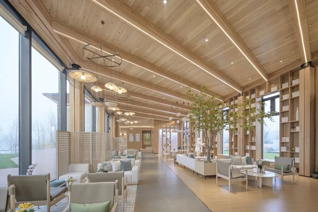 項目著重體現(xiàn)自然、田園、舒適的空間氛圍,重點詮釋木結(jié)構(gòu)空間完整性和體現(xiàn)木結(jié)構(gòu)梁柱的序列感,通過開敞的空間布局方式,營造出空間與建筑之間統(tǒng)一性,體現(xiàn)木結(jié)構(gòu)空間張力與自然美學(xué)氛圍。