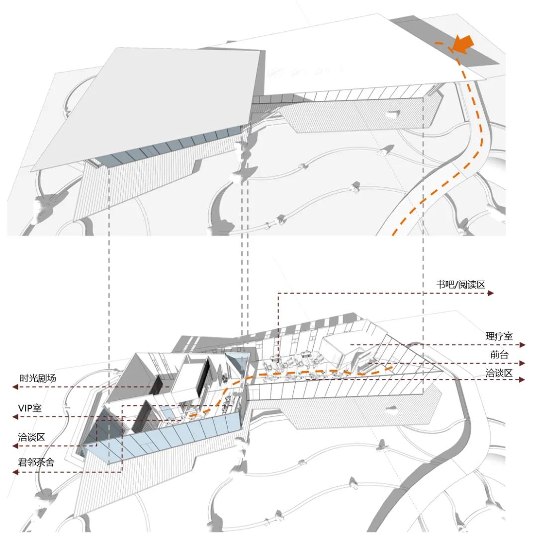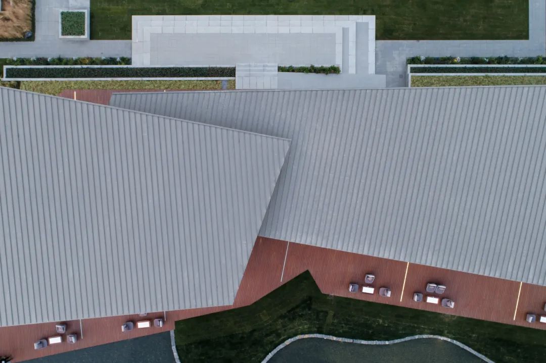 方案早期的屋面排水方案因屋頂造型的斜向坡度,排水集中在中間。考慮到暴雨天氣下,中央排水將會影響到出入口的人員出行。技術(shù)團隊經(jīng)過多輪調(diào)整,在完全不影響立面效果的前提下,調(diào)整鎂鋁錳板直立鎖邊方向及南北朝向標(biāo)高,將排水改為南面分散式排水,保證了極端天氣情況下建筑的人員出行。