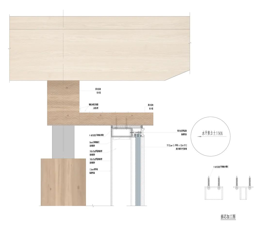 幕墻與木結(jié)構(gòu)連接處,由于木結(jié)構(gòu)的特殊性無法進行常規(guī)的焊接操作。一般的操作方法是采用對穿螺桿的形式,對于安裝精度要求太高,且需要保證加強鋼板、插芯底板、木板孔的位置均無誤差才能進行有效安裝。技術(shù)團隊經(jīng)過實踐,研究設(shè)計出幕墻的插芯采用螺釘直接連接,現(xiàn)場可操作性較強。由于幕墻為下端支撐,上端僅有風(fēng)荷載和水平地震產(chǎn)生的水平剪力,相對于條狀的木板來說,受力方向非常有利,安全性極強。
