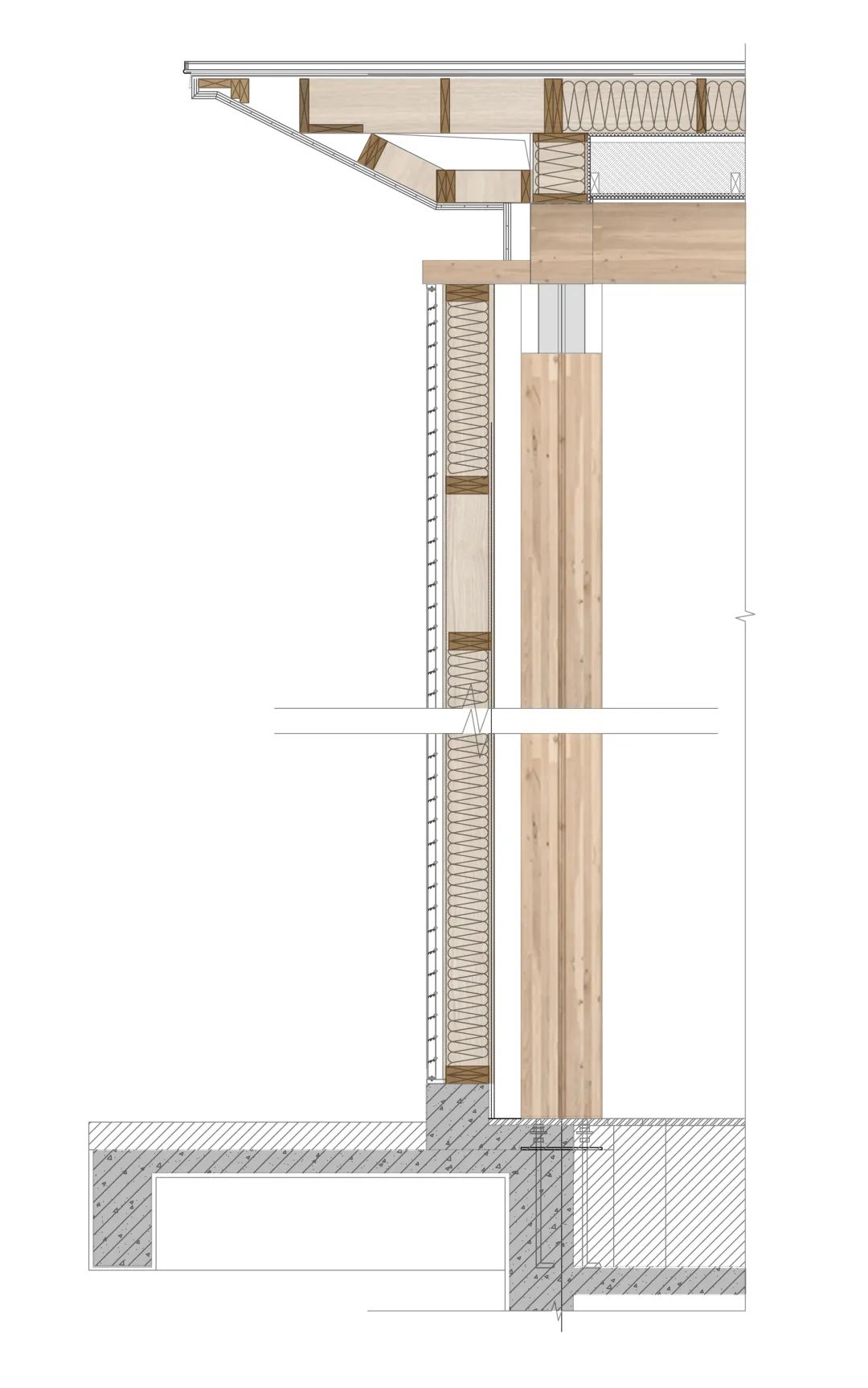 在兼顧立面效果和結(jié)構(gòu)強度的同時,屋頂與幕墻、實墻的連接處,技術(shù)團隊創(chuàng)新性地采用頂部檐口做薄覆以斜面CLT的方式。既解決了檐口裝飾,又解決了幕墻收口,并于結(jié)構(gòu)形成的凹槽處設(shè)置燈帶,美化了建筑夜景表現(xiàn)。