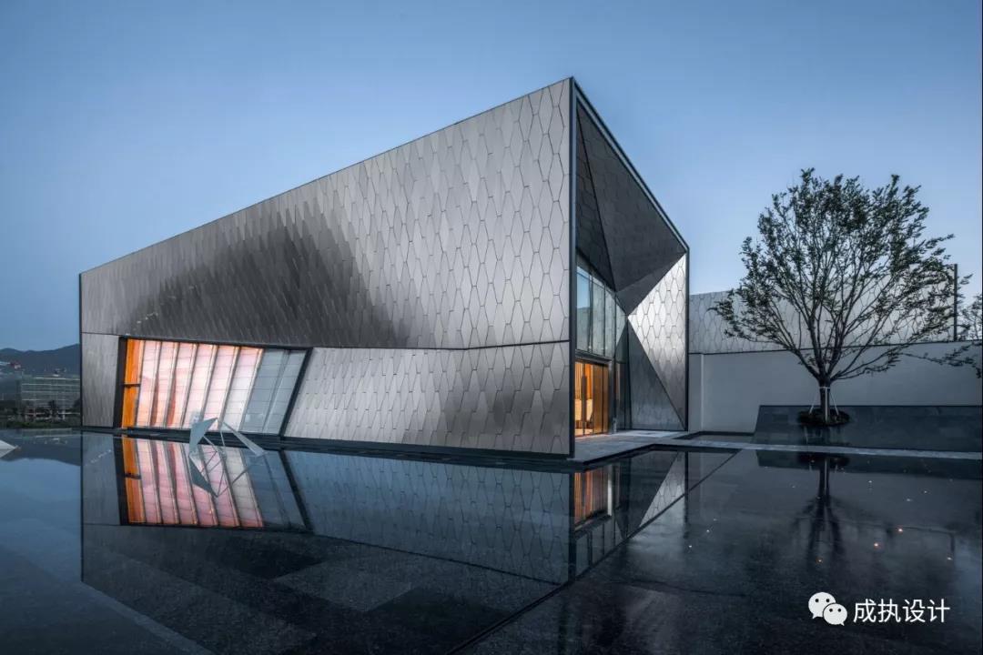 御臨府項目如仙鶴一般傲立于懸崖之上,順應(yīng)地形,并最大化利用景觀資源。菱形格構(gòu)強調(diào)空間的連續(xù)性。表皮采用參數(shù)化設(shè)計,精確控制每塊鋁板的折角變化。