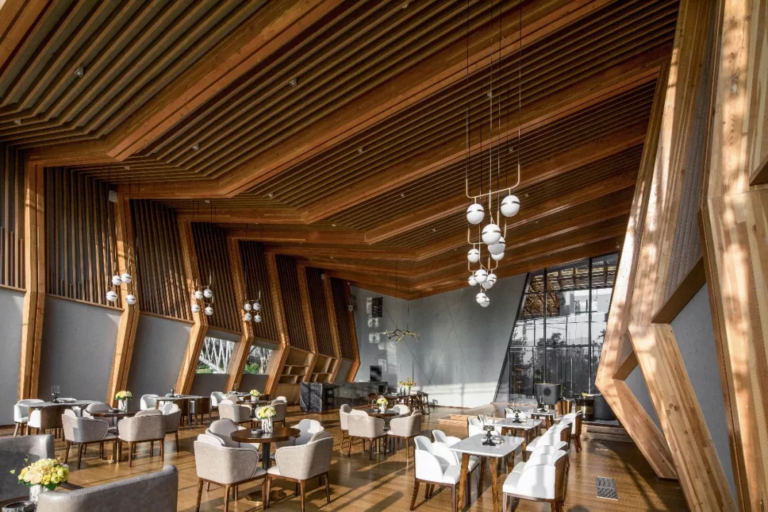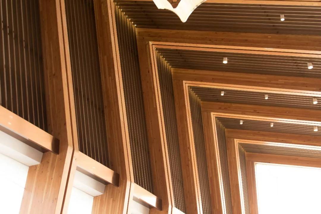 通過木材預(yù)制,木構(gòu)折線的搭接干凈利落,塑造出傳承傳統(tǒng)折坡屋頂?shù)膬?nèi)部空間,同時又呈現(xiàn)出表皮上的灰色壓紋的漸變,完美實現(xiàn)了表皮貼合形態(tài)的設(shè)計要求,而且大大縮短了施工周期。李杰談到,一體化的施工方式將成為中國未來設(shè)計與建造的主流手段。