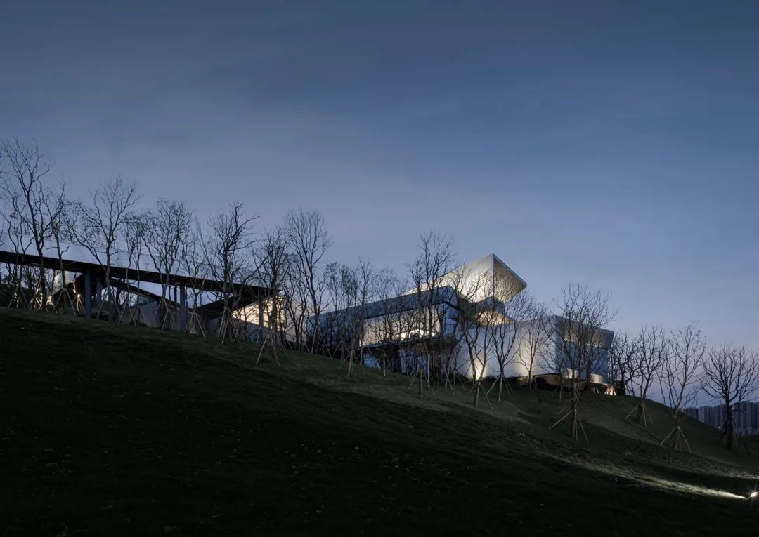 本案毗鄰重慶渝北區(qū)花石溝公園,基地位于小山坡上,設(shè)計師讓建筑與環(huán)境和平共處,并不試圖破壞或戰(zhàn)勝它們的直接背景。作為社區(qū)活動中心,希望人們不再仰視它,而是放低視角親自體驗它,這才是建筑的歸宿。