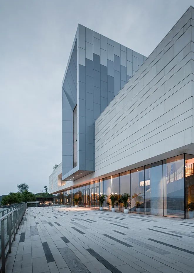 項目毗鄰龍興古鎮(zhèn),御臨河邊,有遠山起伏,綠化集中,東側(cè)景觀極佳,而其余方向則乏善可陳。作為對環(huán)境的回應(yīng),建筑師將三個體量不同的盒子并列于山坡上,垂直于濱河道路,以期達到濱河景觀及遠山的最佳觀賞。通過建筑與環(huán)境的互塑共生,使遠山、河流、庭院、建筑重塑構(gòu)成新的秩序,營造獨有坡地特征的建筑群落。